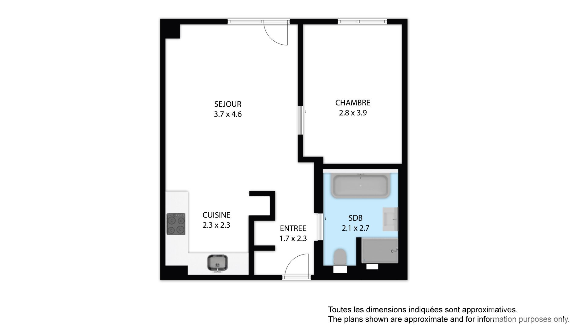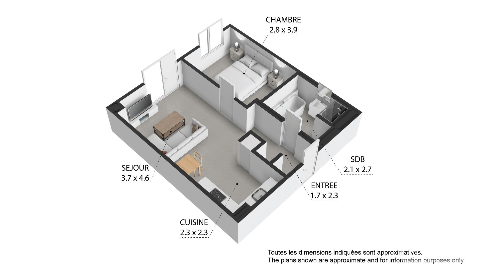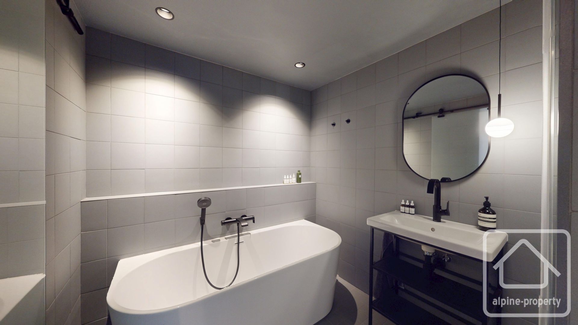 Hall d'entrée avec double espace de rangement, salle de bains spacieuse avec chauffage au sol, baignoire îlot, douche et WC, couloir donnant sur une cuisine/salle à manger/salon décloisonnée sur mesure s'ouvrant sur une grande terrasse ensoleillée, chambre double spacieuse avec fenêtre donnant sur le massif du Mont-Blanc.
