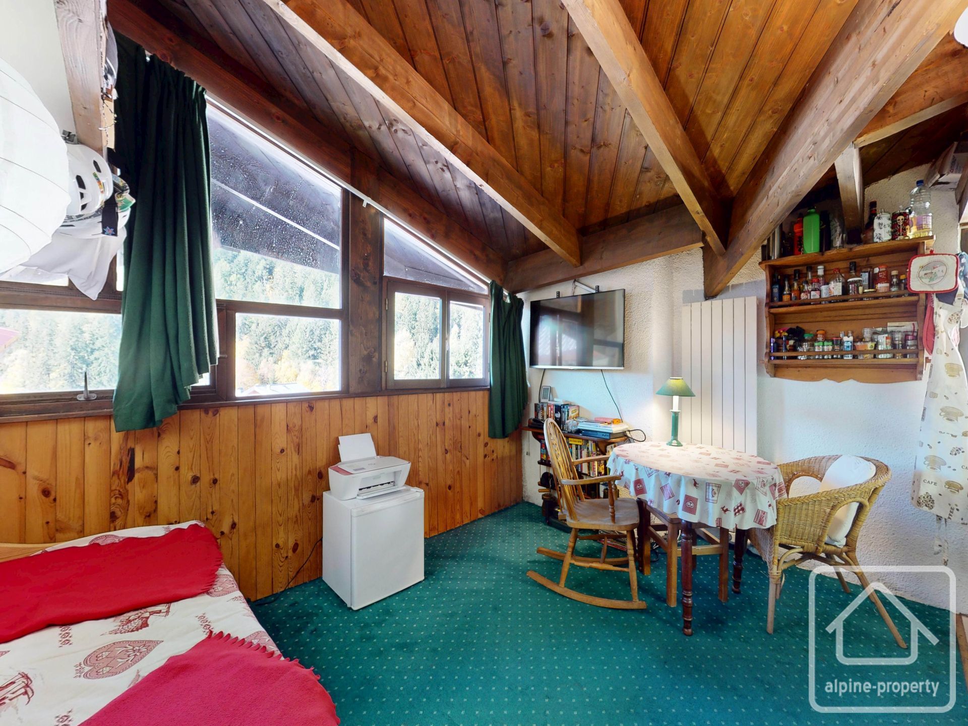 Le Studio Bruyères bénéficie de fenêtres sur toute la largeur du séjour exposé ouest, d’où l’on peut même apercevoir le massif du Mont-Blanc ! Une autre fenêtre dans la kitchenette offre une vue dégagée en direction du célèbre domaine des Grands Montets.