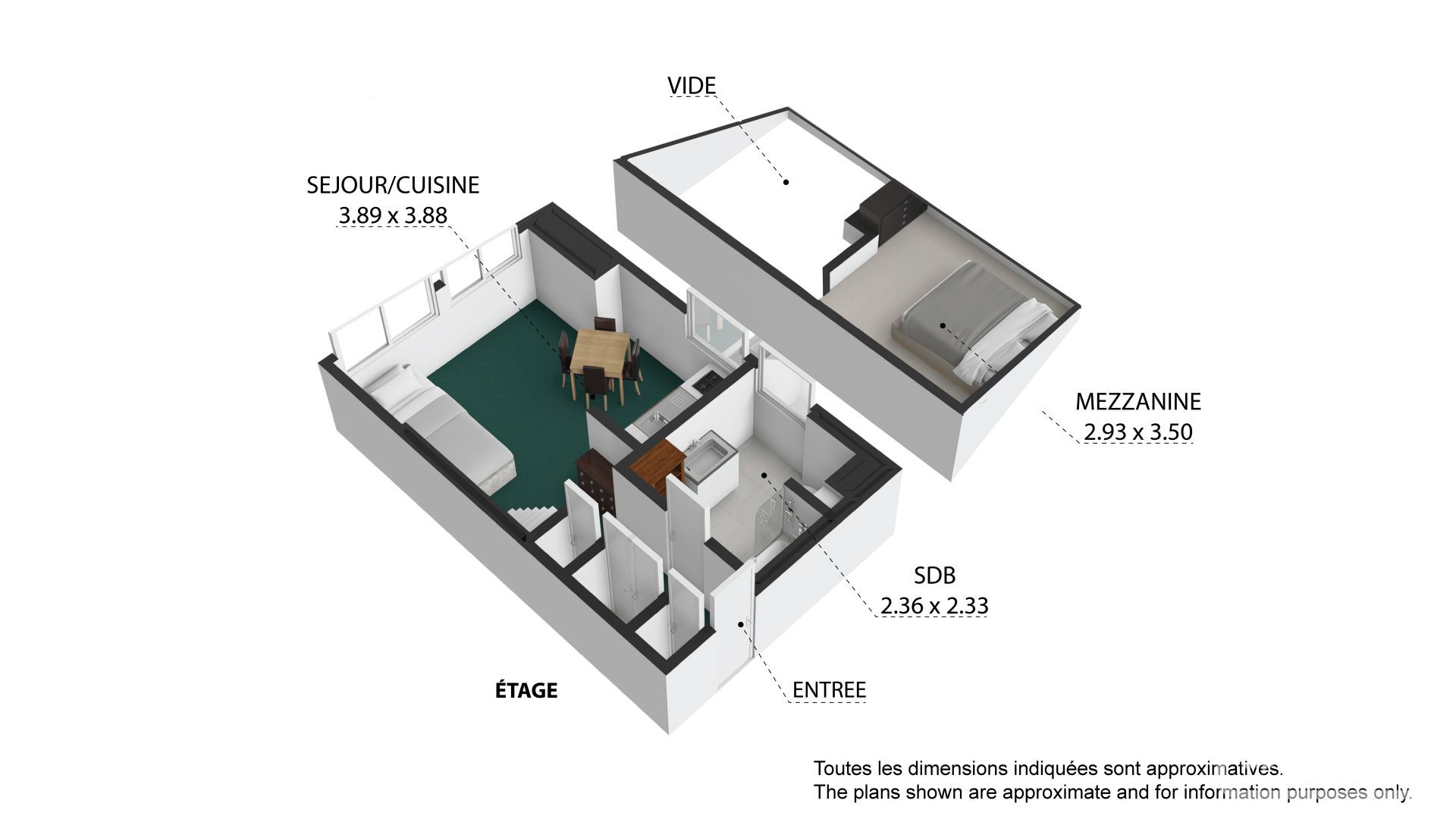 Hall d’entrée avec rangements, salle de bain avec WC, pièce de vie avec kitchenette, escalier menant à une chambre en mezzanine avec rangements.