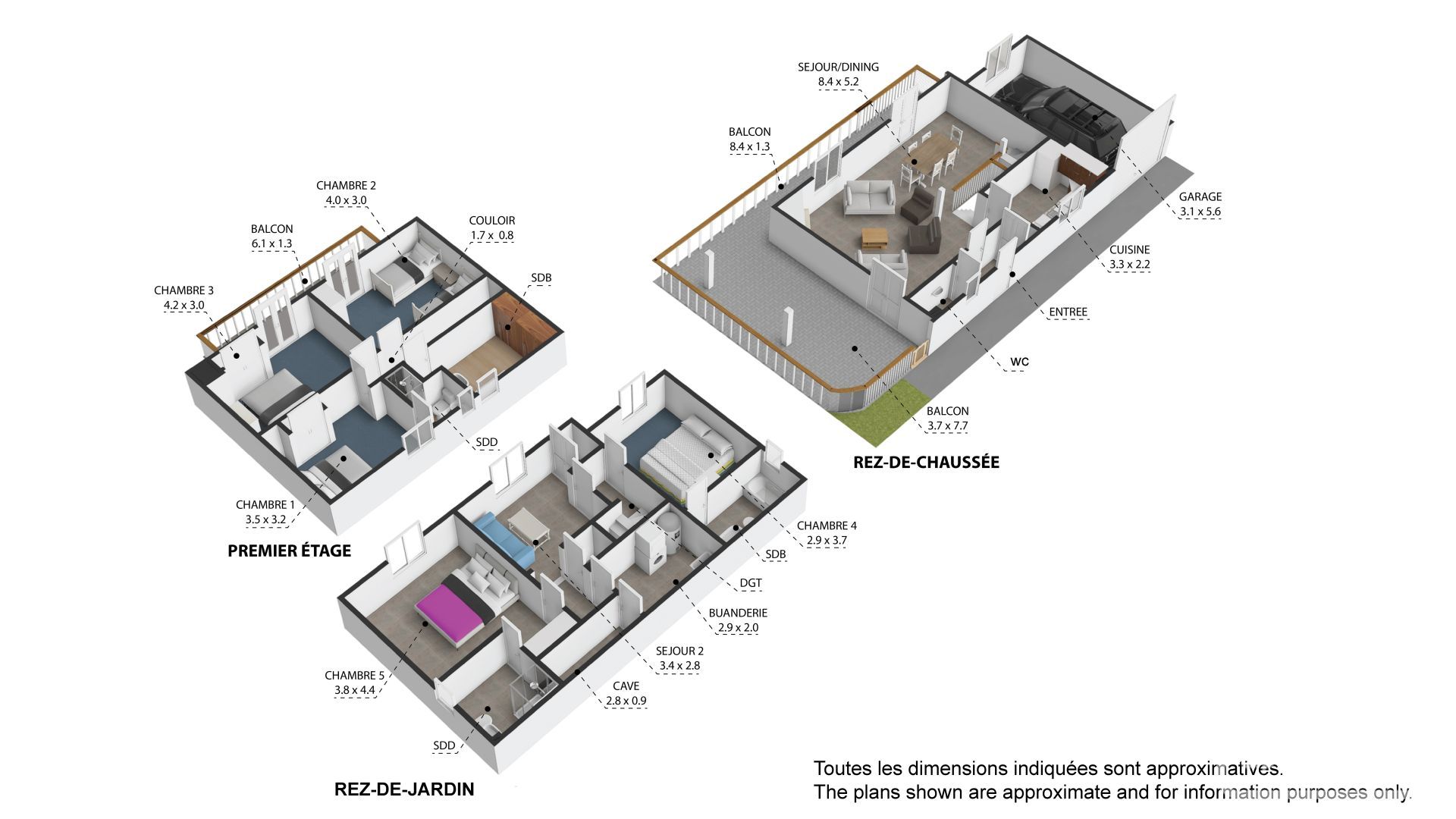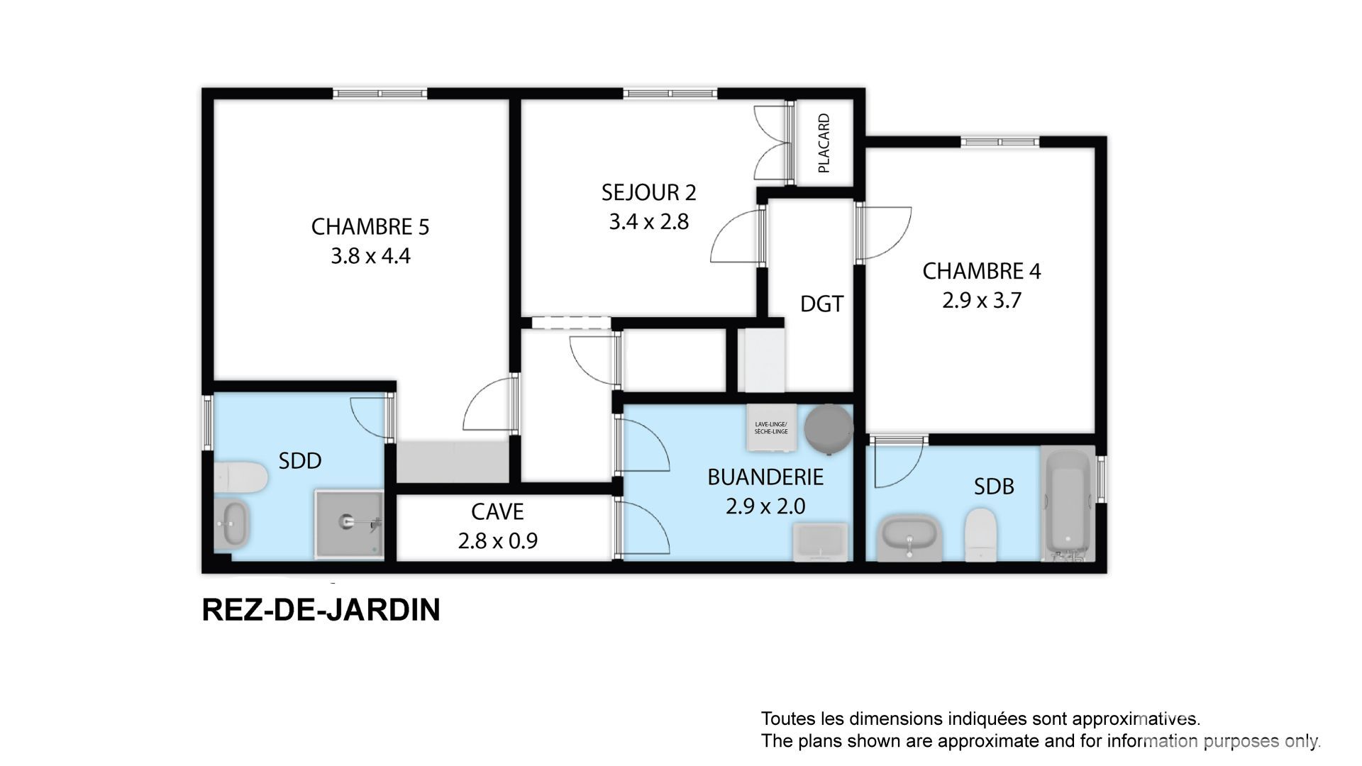 Au rez-de-jardin : deux chambres doubles avec salles d’eau privatives, un salon/salle TV, une buanderie, une cave et un espace de rangement sous l’escalier.