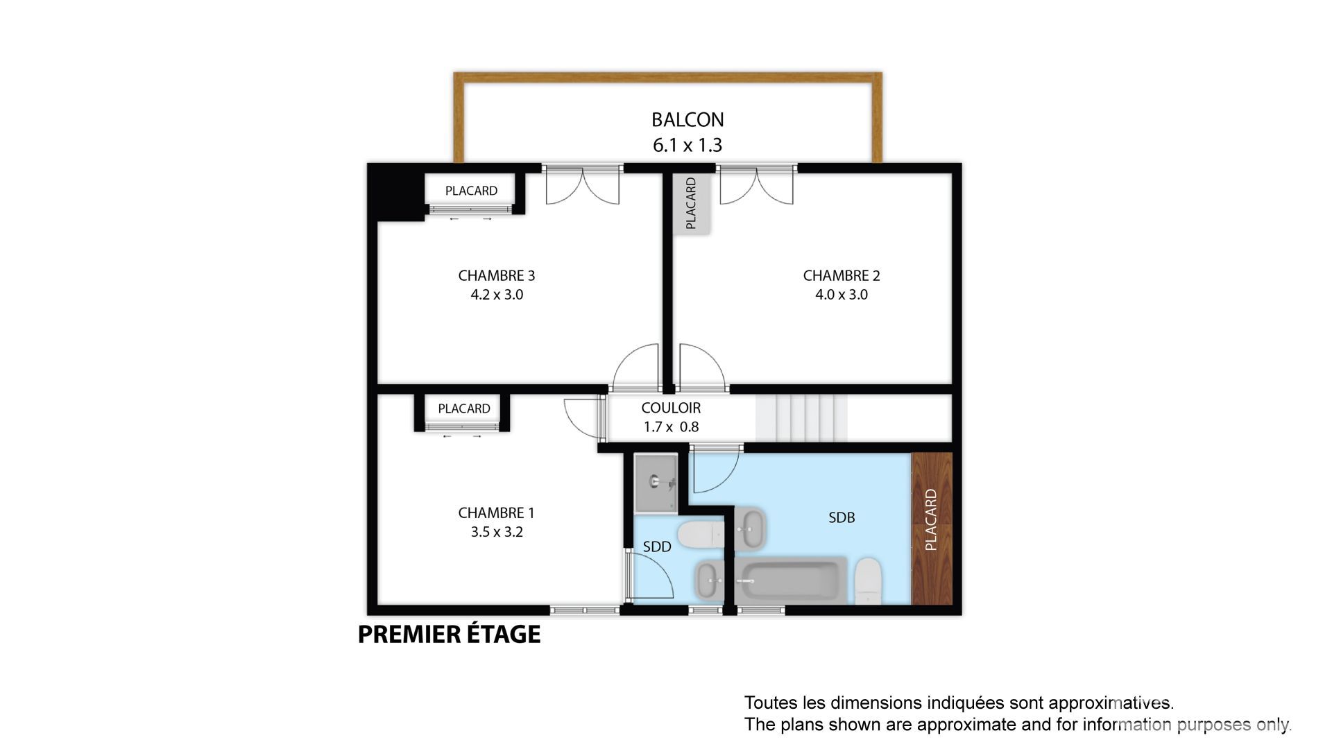 Au premier étage : deux chambres doubles avec balcon exposé sud, une chambre double avec salle d’eau attenante, ainsi qu’une salle de bains familiale.
