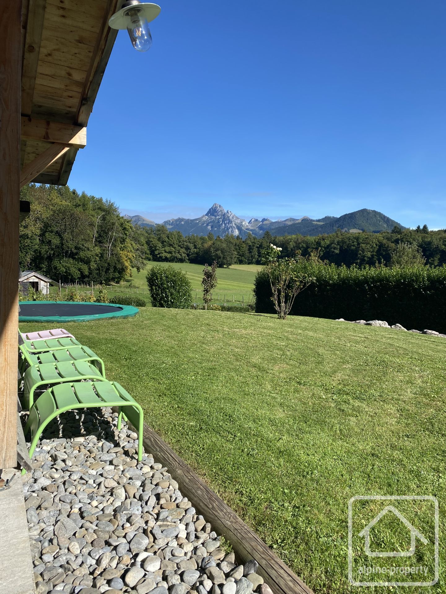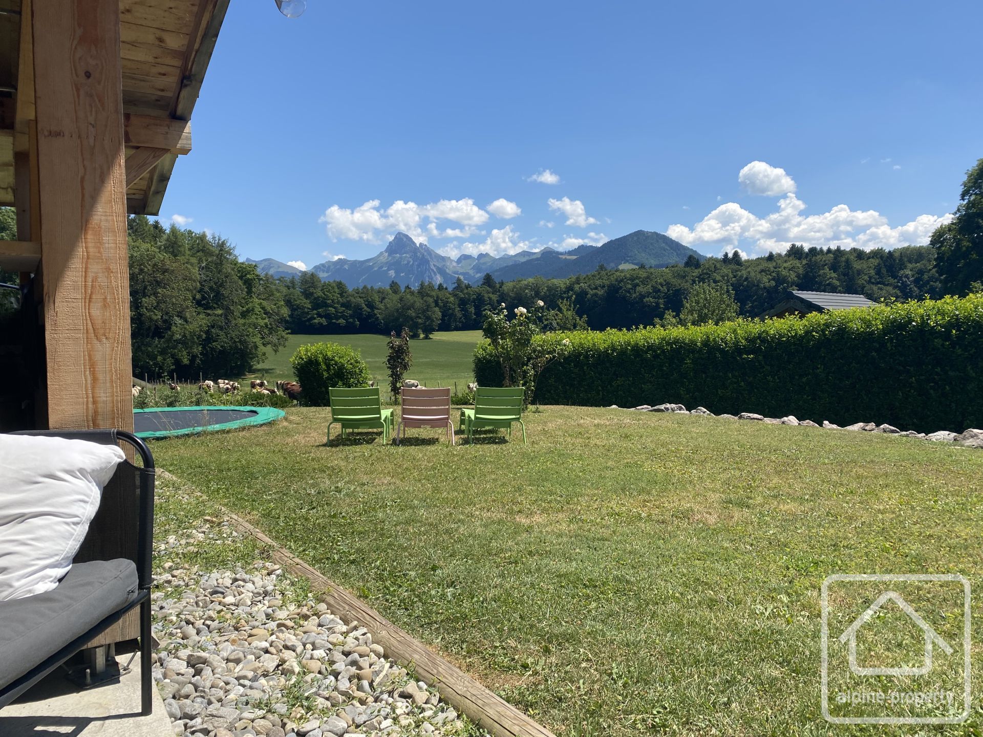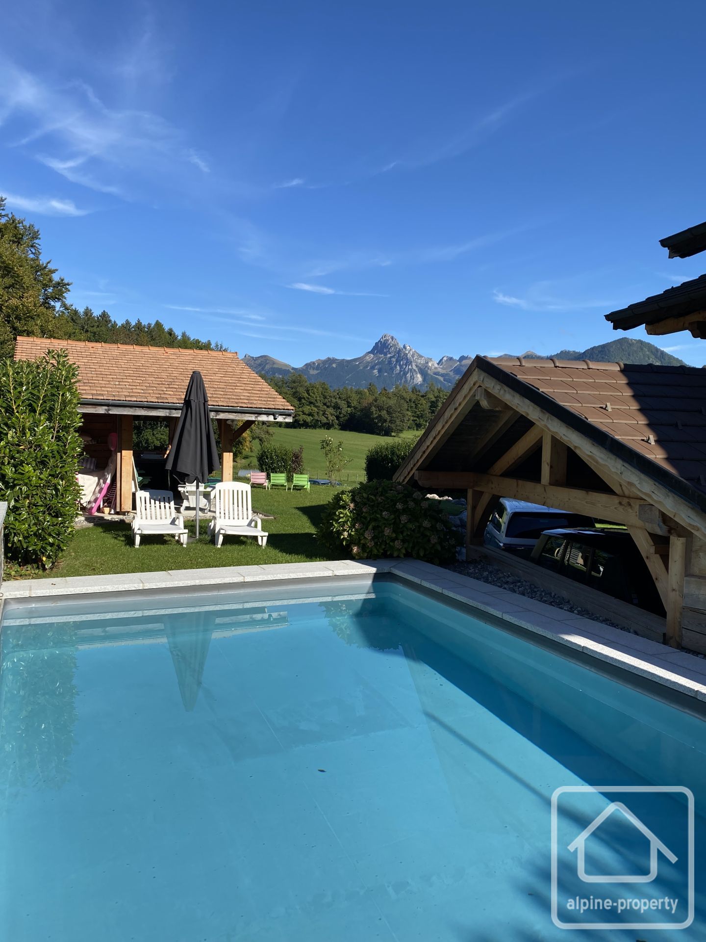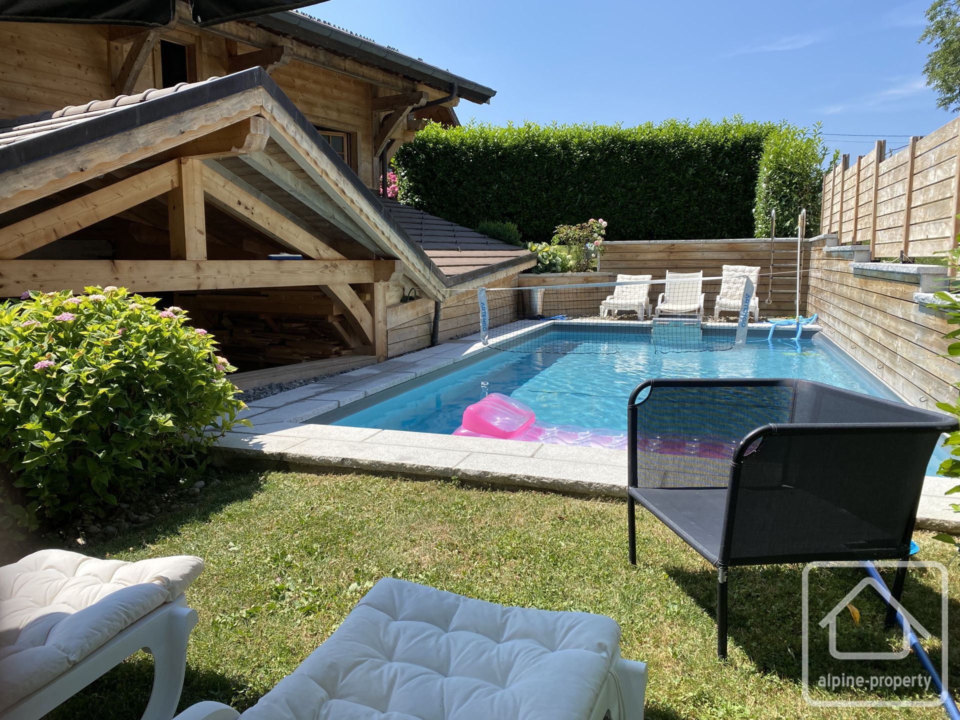 À l’extérieur : le chalet est implanté dans un agréable jardin paysager avec cuisine d’été et piscine chauffée par pompe à chaleur.