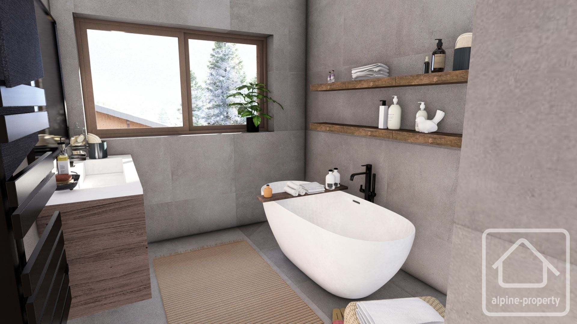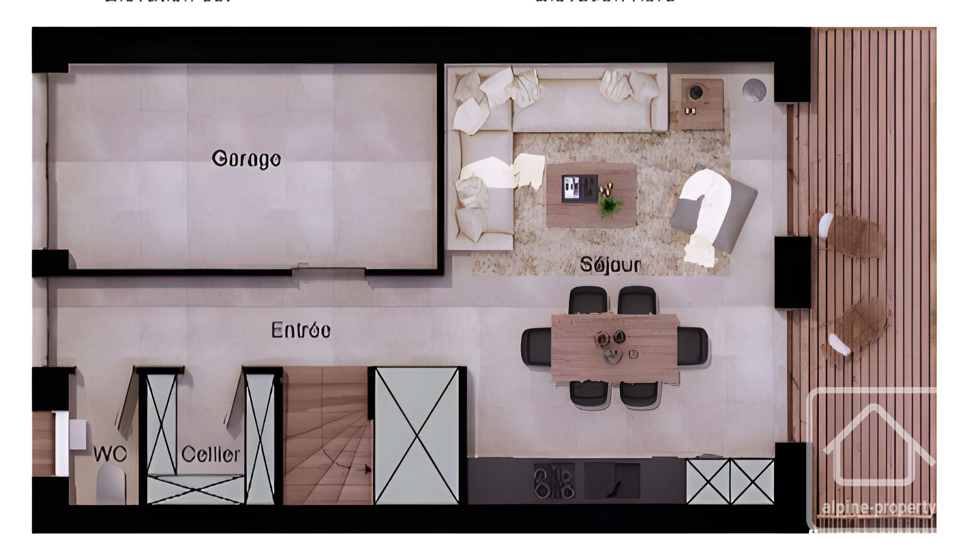 Il comprend trois chambres, dont une suite parentale avec salle de douche privative, ainsi qu’une salle de bains supplémentaire, idéale pour une vie de famille confortable. La pièce de vie ouverte donne accès à une terrasse de 11 m² et à un jardin privatif de 247 m², parfaits pour profiter de l’extérieur dans un cadre montagneux.