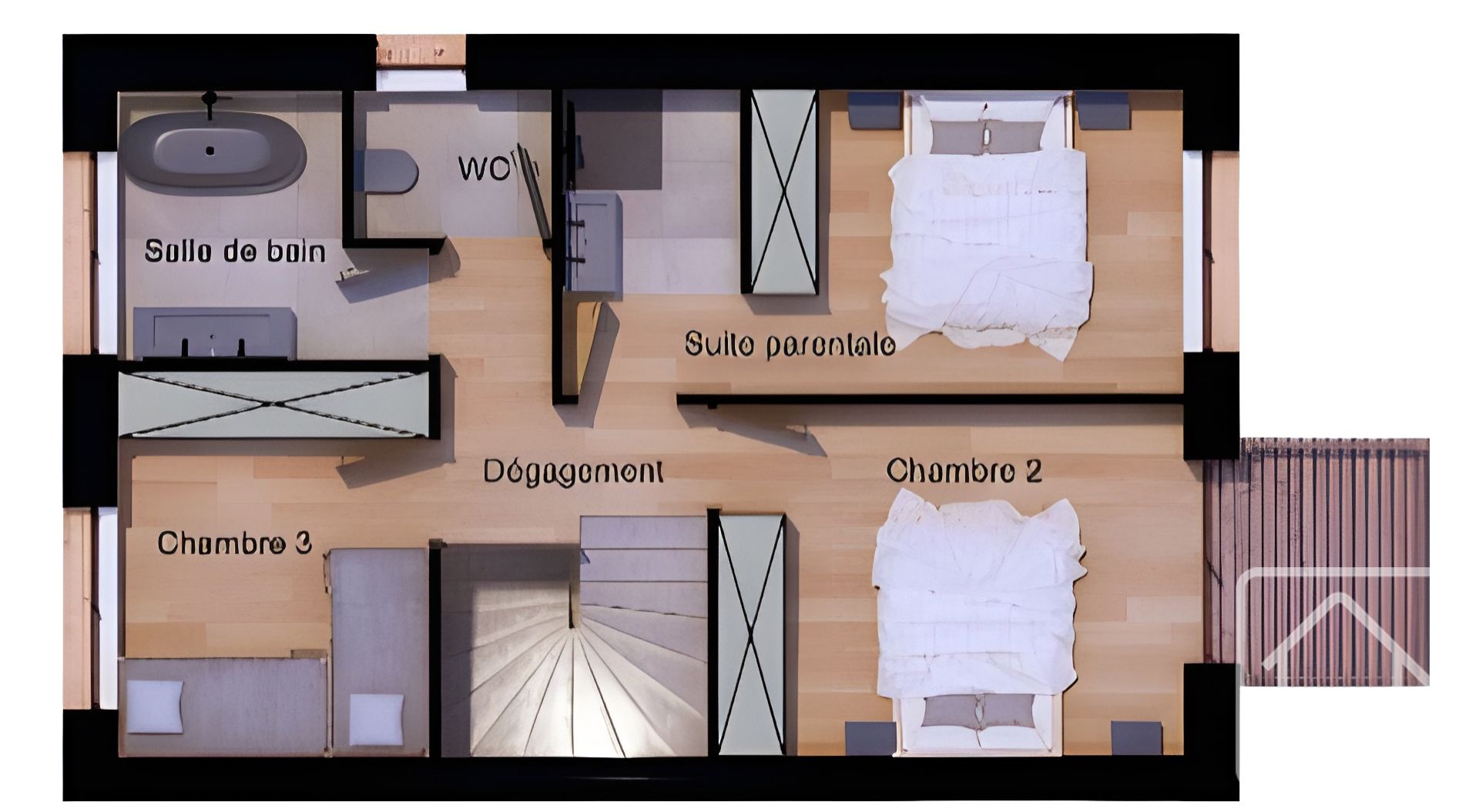Étage : chambre parentale avec balcon et salle d’eau attenante, deux autres chambres, salle de bains familiale, WC.