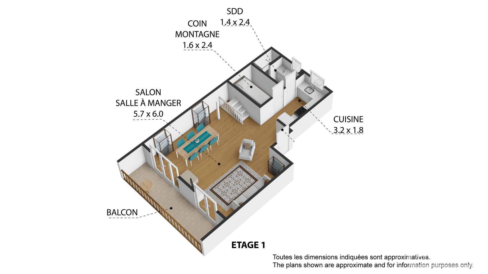 • Niveau principal : Une cuisine équipée, moderne ouverte sur un séjour chaleureux ouvrant sur un balcon pour profiter du panorama, un coin montagne, ainsi qu'une salle d'eau avec WC complètent ce niveau.