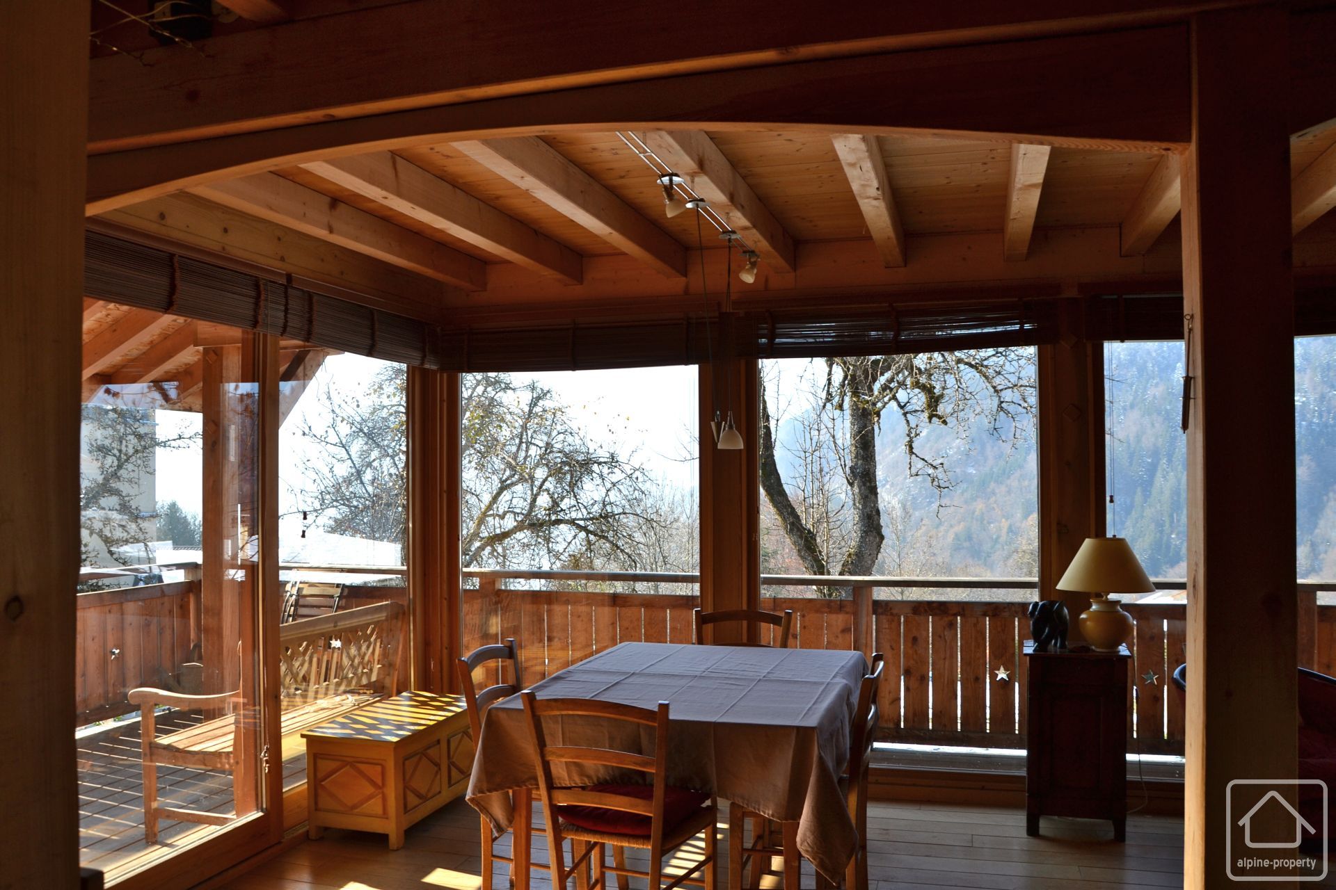L'exposition plein sud permet au chalet de profiter des bienfaits des rayons du soleil grâce aux baies vitrées de la pièce de vie où trône un poêle Godin qui répand sa chaleur jusqu'au premier étage.