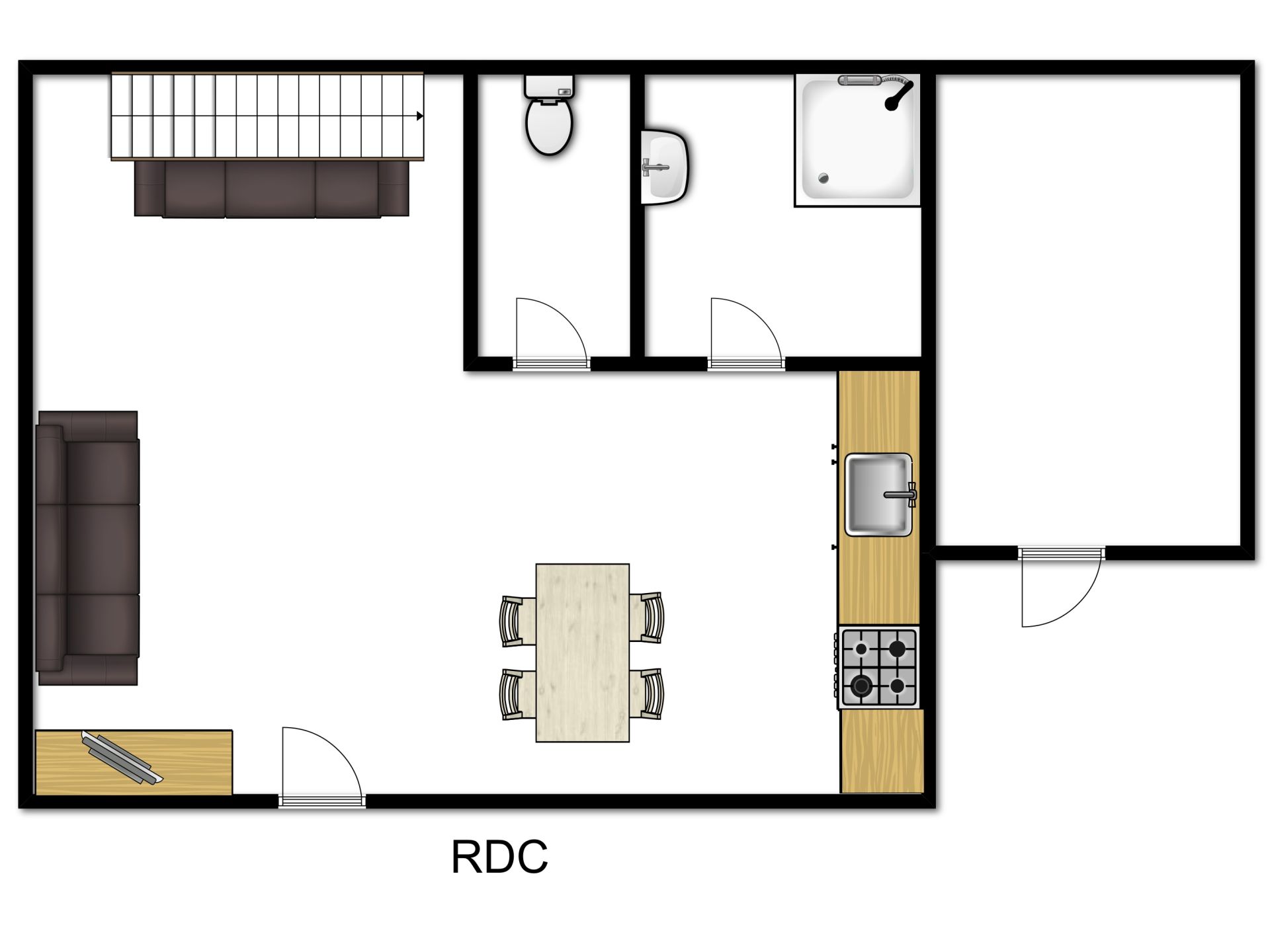 Rez-de-chaussée : pièce à vivre englobant une cuisine aménagée, un espace repas pouvant accueillir six personnes et un coin-salon meublé de deux canapés ; salle d’eau avec douche ; toilettes.
