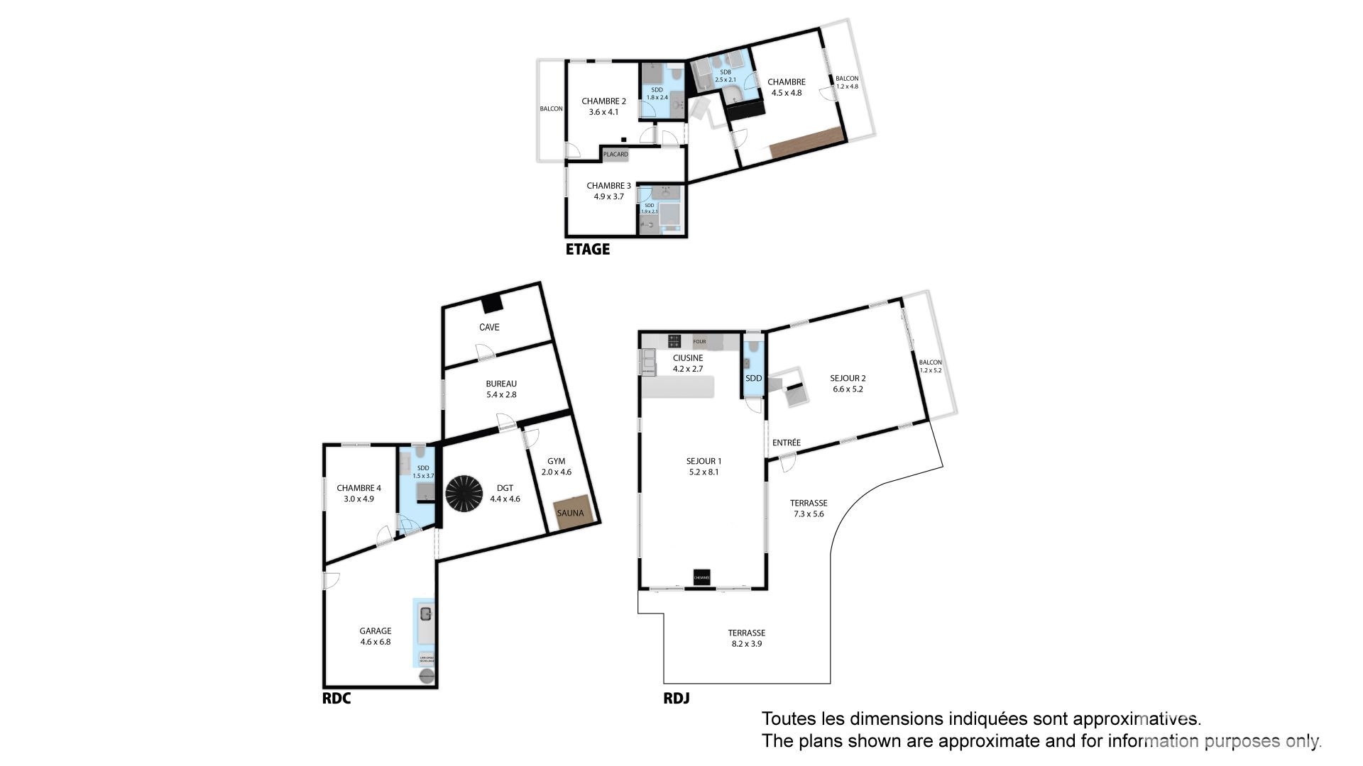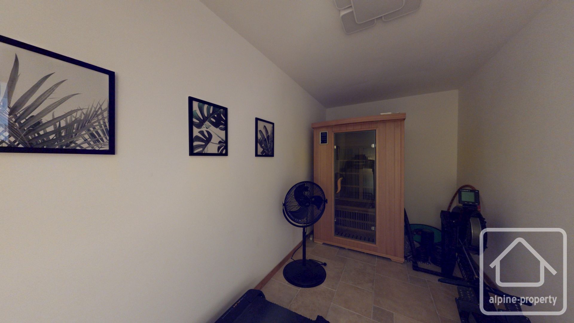 **Niveau inférieur : espace détente, salle de sport avec sauna, bureau, local de rangement, double garage, et quatrième chambre double avec salle d’eau en suite.**