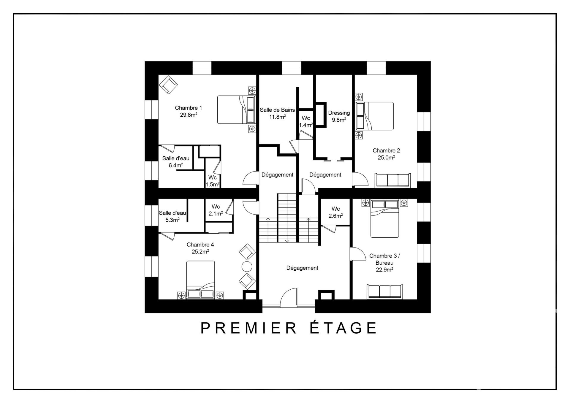 Le rez-de-chaussée comprend une cuisine accueillante équipée d’un poêle à bois ornemental, un salon chaleureux avec cheminée, une buanderie, une salle de jeux, une chaufferie, un WC, une douche et des rangements. Le premier étage offre quatre grandes chambres, dont deux avec salle d’eau attenante, une avec salle de bains et dressing, ainsi qu’un WC supplémentaire.