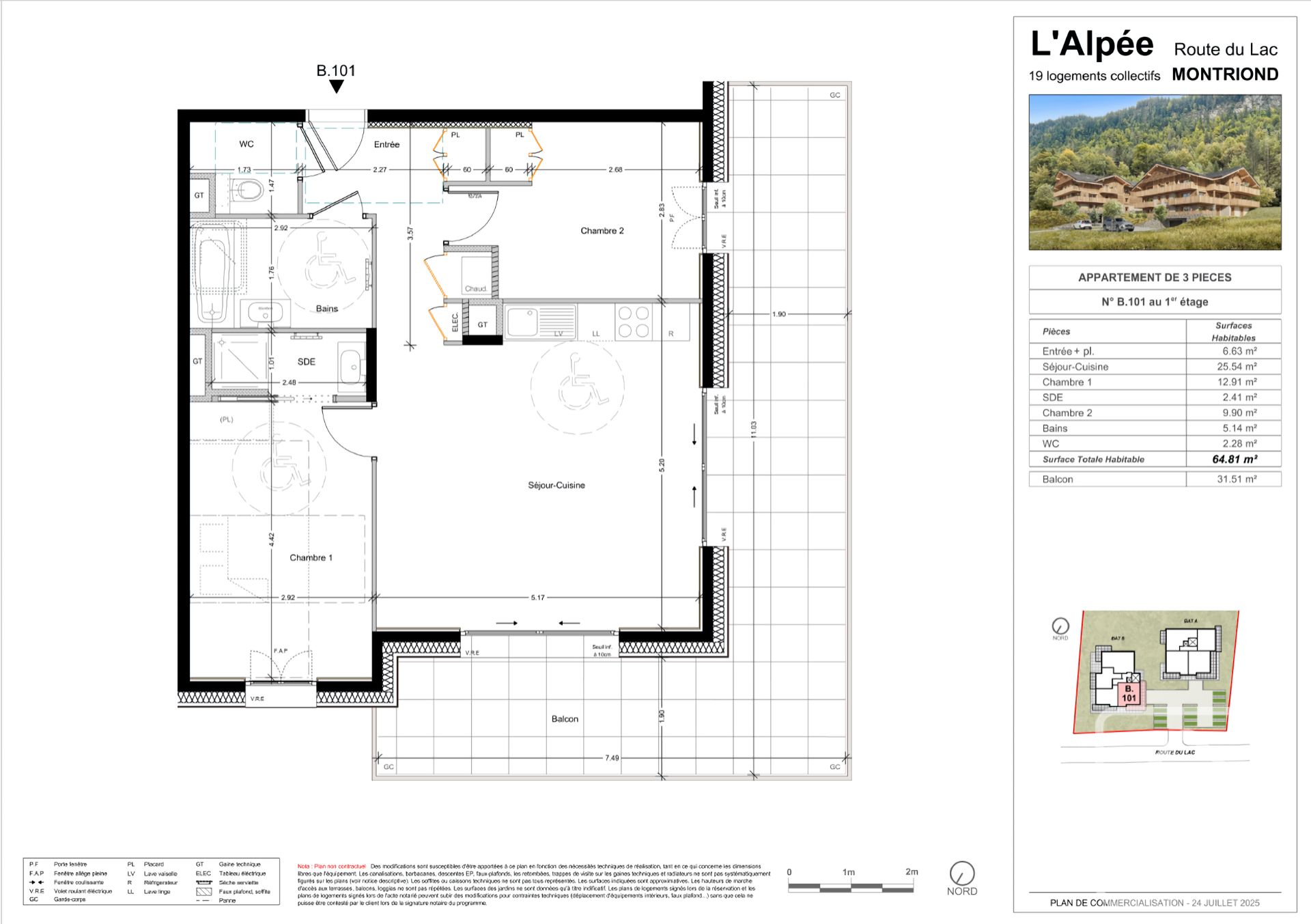 Appt B101 est situé au premier étage de la résidence. Il comprend deux chambres, dont une avec salle d’eau attenante et accès au balcon, ainsi qu’une seconde salle de bains permettant l’installation d’une baignoire et un WC séparé. L’espace cuisine/séjour ouvert offre une belle surface de 25,54 m², avec des portes-fenêtres donnant sur un superbe balcon filant de 31,5 m². La surface totale de l’appartement est de 64,81 m².