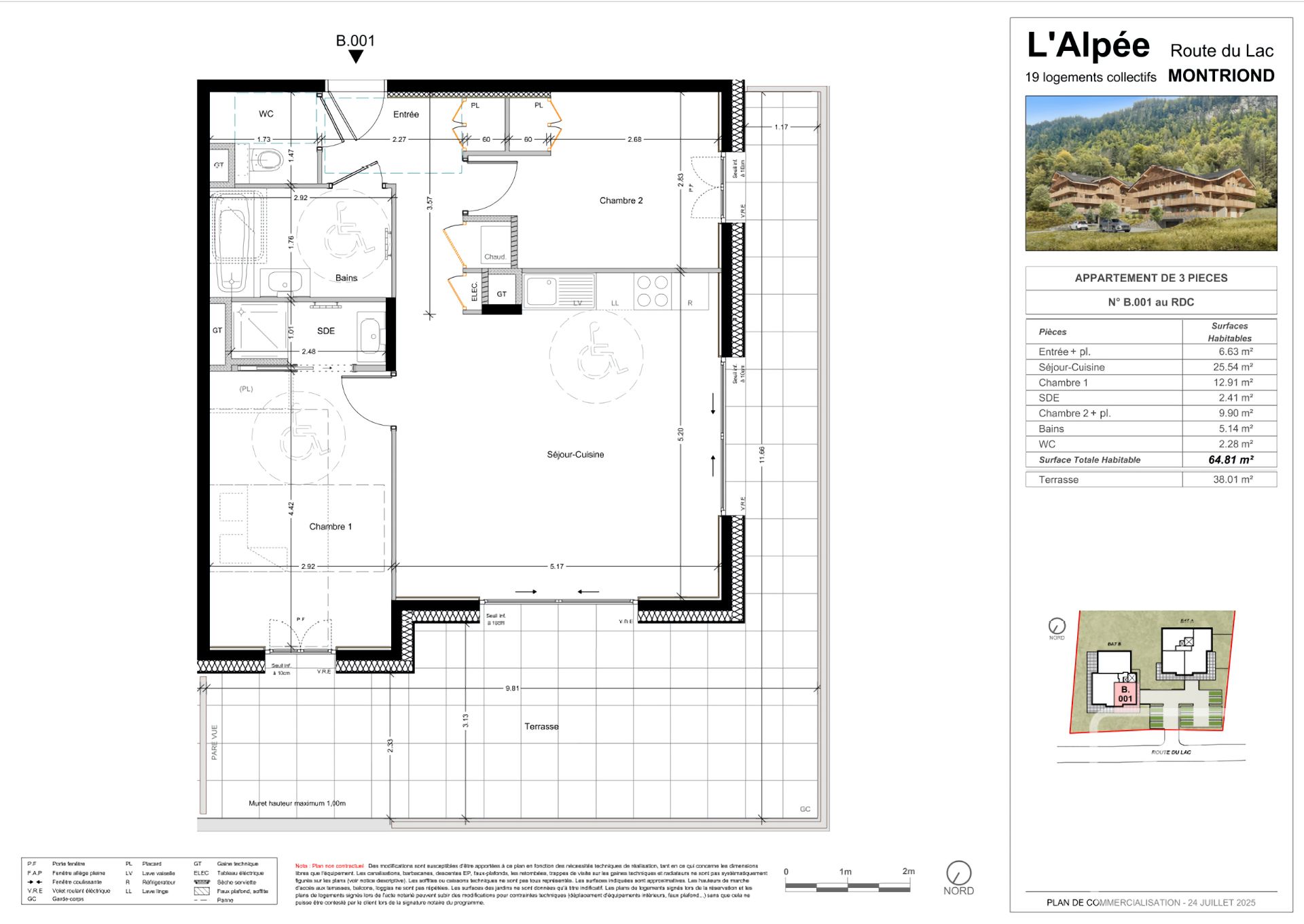 Appt B001 est situé au rez-de-chaussée de la résidence, il comprend deux chambres, dont une avec salle de douche attenante, toutes deux avec accès à la superbe terrasse filante. Il dispose également d’une salle de bains supplémentaire avec emplacement prévu pour une baignoire, ainsi que de WC séparés. La cuisine et le séjour sont en espace ouvert et offrent une belle superficie de 25,5 m², avec des portes-fenêtres sur deux côtés donnant accès à la terrasse de 38 m². La surface totale de l’appartement est de 64,81 m².
