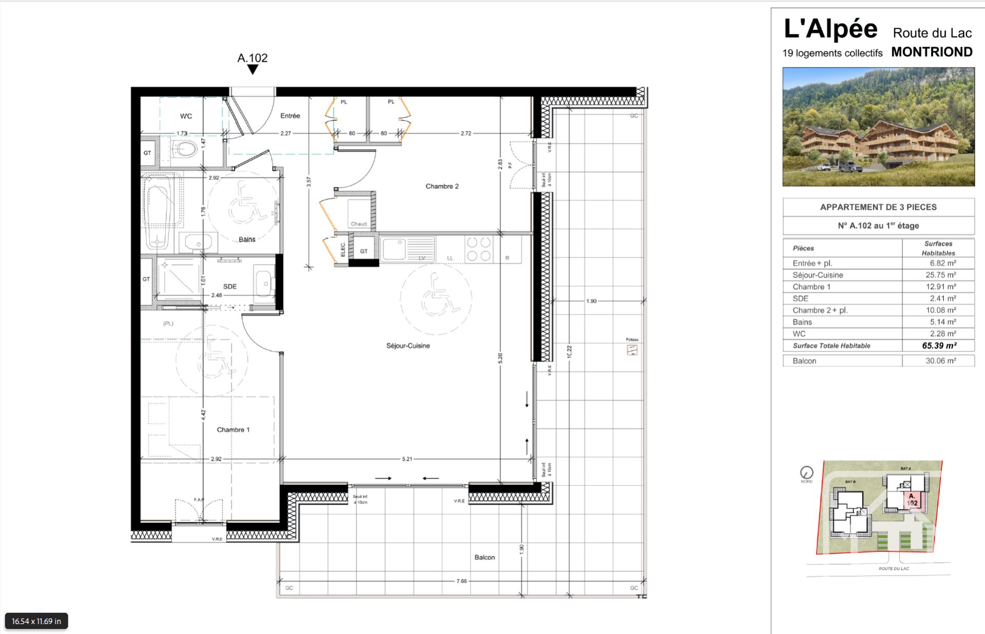 Appt A102 est situé au premier étage de la résidence. Il comprend deux chambres et deux salles de bains, dont l’une permet l’installation d’une baignoire, ainsi qu’un WC séparé. L’espace cuisine/séjour ouvert est lumineux et spacieux, avec une surface de 25,75 m², et dispose de deux portes-fenêtres donnant sur un généreux balcon filant de 30 m². La surface totale de l’appartement est de 65,39 m².