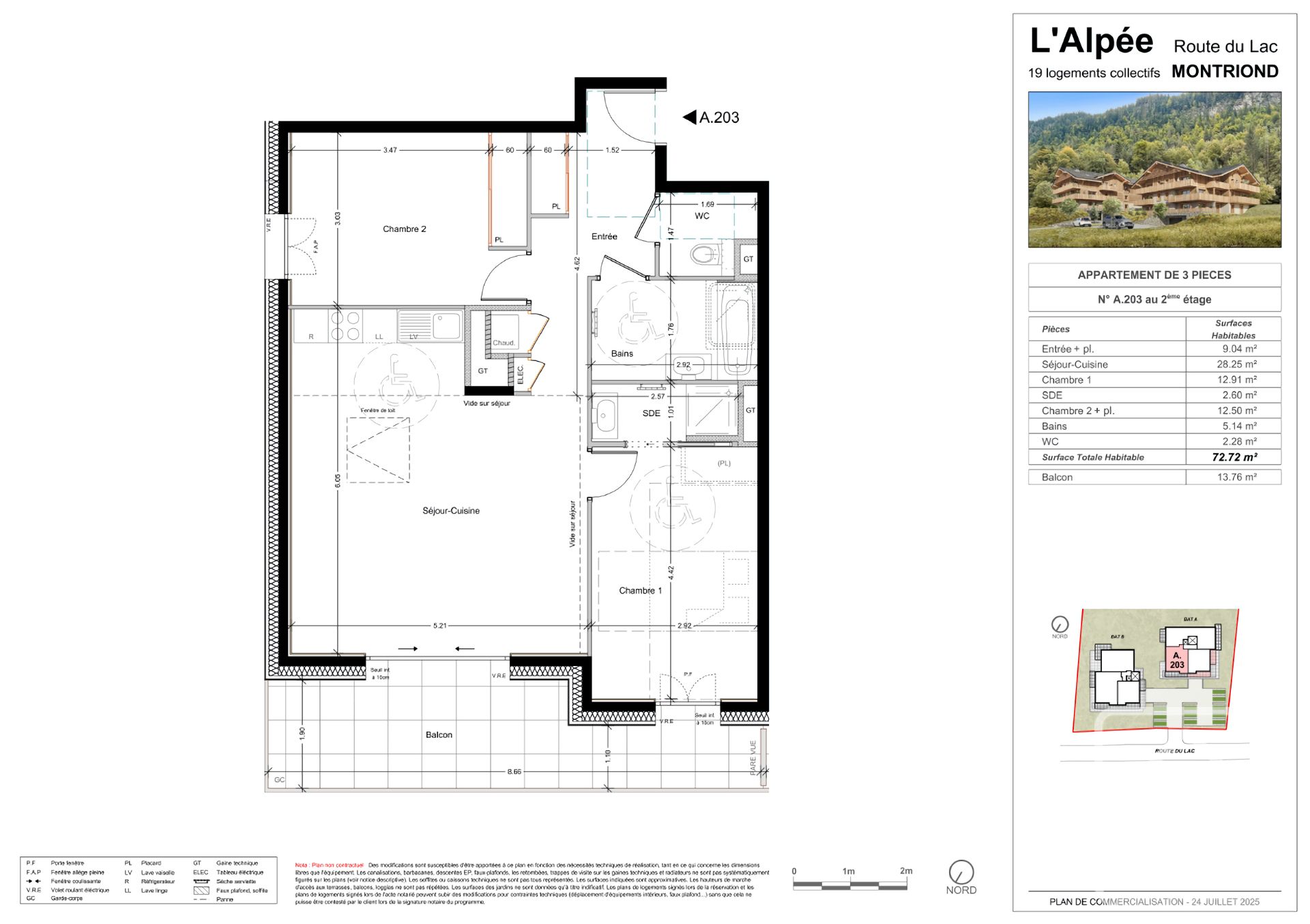 Appt A203 est situé au deuxième étage de la résidence. Il comprend deux chambres, dont une avec salle d’eau attenante et accès au balcon. Une seconde salle de bains, permettant l’installation d’une baignoire, ainsi qu’un WC séparé complètent l’ensemble. L’espace cuisine/séjour ouvert est généreusement dimensionné avec 28,25 m² et dispose de portes-fenêtres donnant sur un balcon de près de 14 m². La surface totale de l’appartement est de 72,72 m².