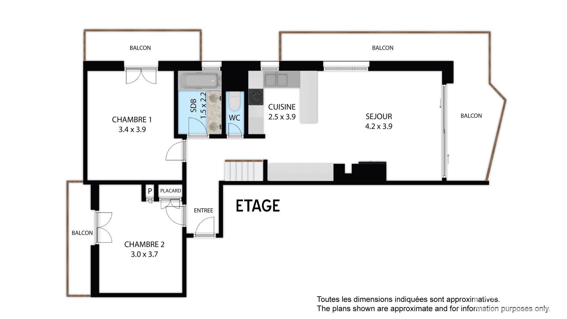 Au premier niveau de l’appartement se trouve une entrée, la cuisine ouverte, et une espace à vivre comprenant salle à manger et séjour confortable avec une cheminée. De l’espace à vivre, on a accès à une belle terrasse et un balcon qui contourne l’appartement. Deux grandes chambres aussi à ce niveau, chacun avec son balcon, partage une salle de bains avec douche et baignoire, et un WC séparé.