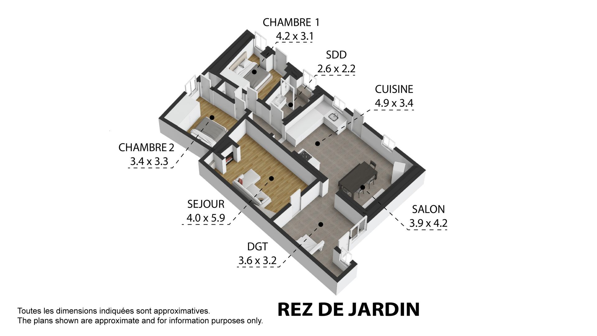 Au rez-de-jardin, on trouve une rénovation traditionnelle intégrant avec soin les éléments d’origine restaurés dans un cadre de vie contemporain. Entretenu à un haut niveau par les propriétaires actuels, les dernières rénovations ont été réalisées en 2022.