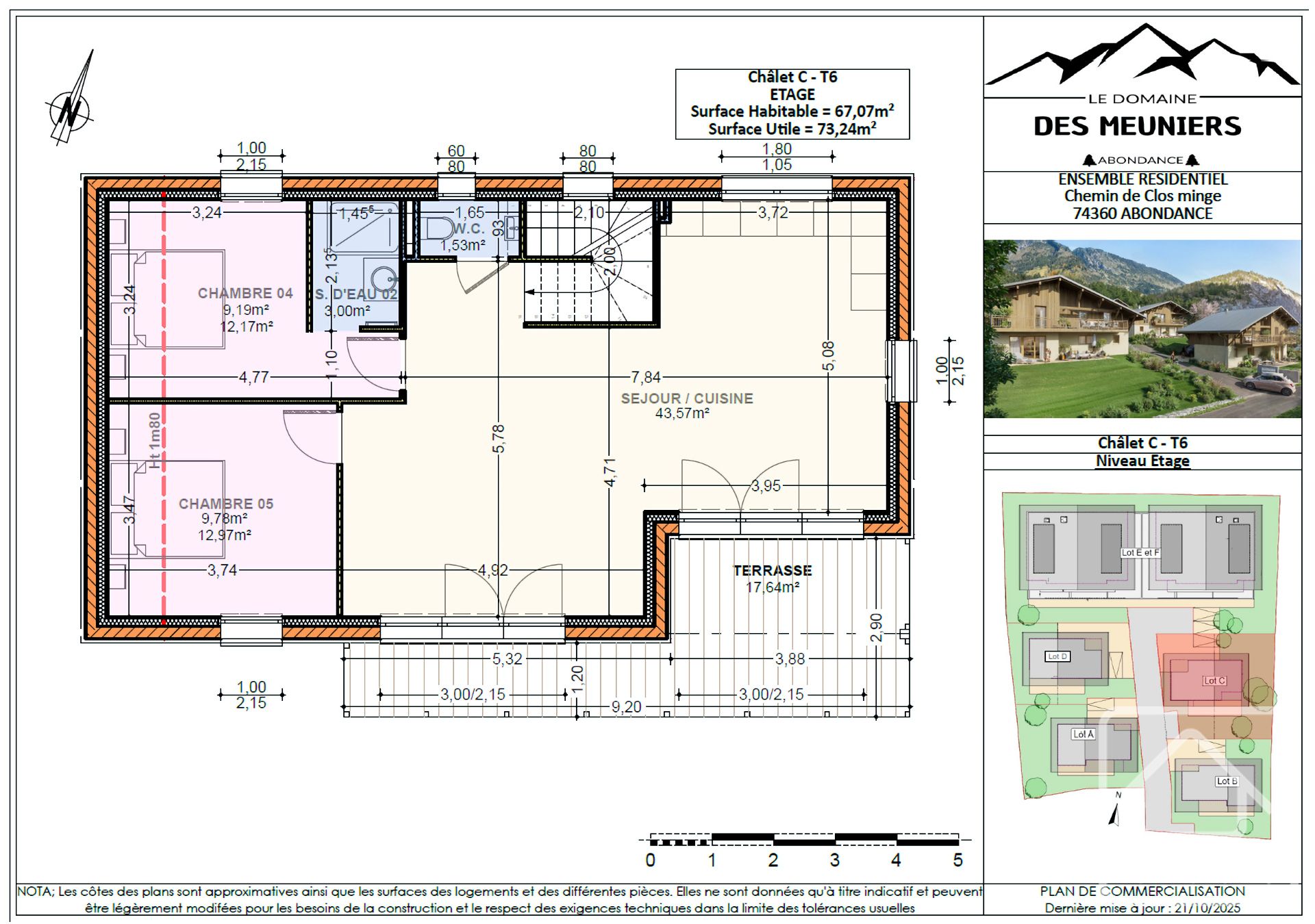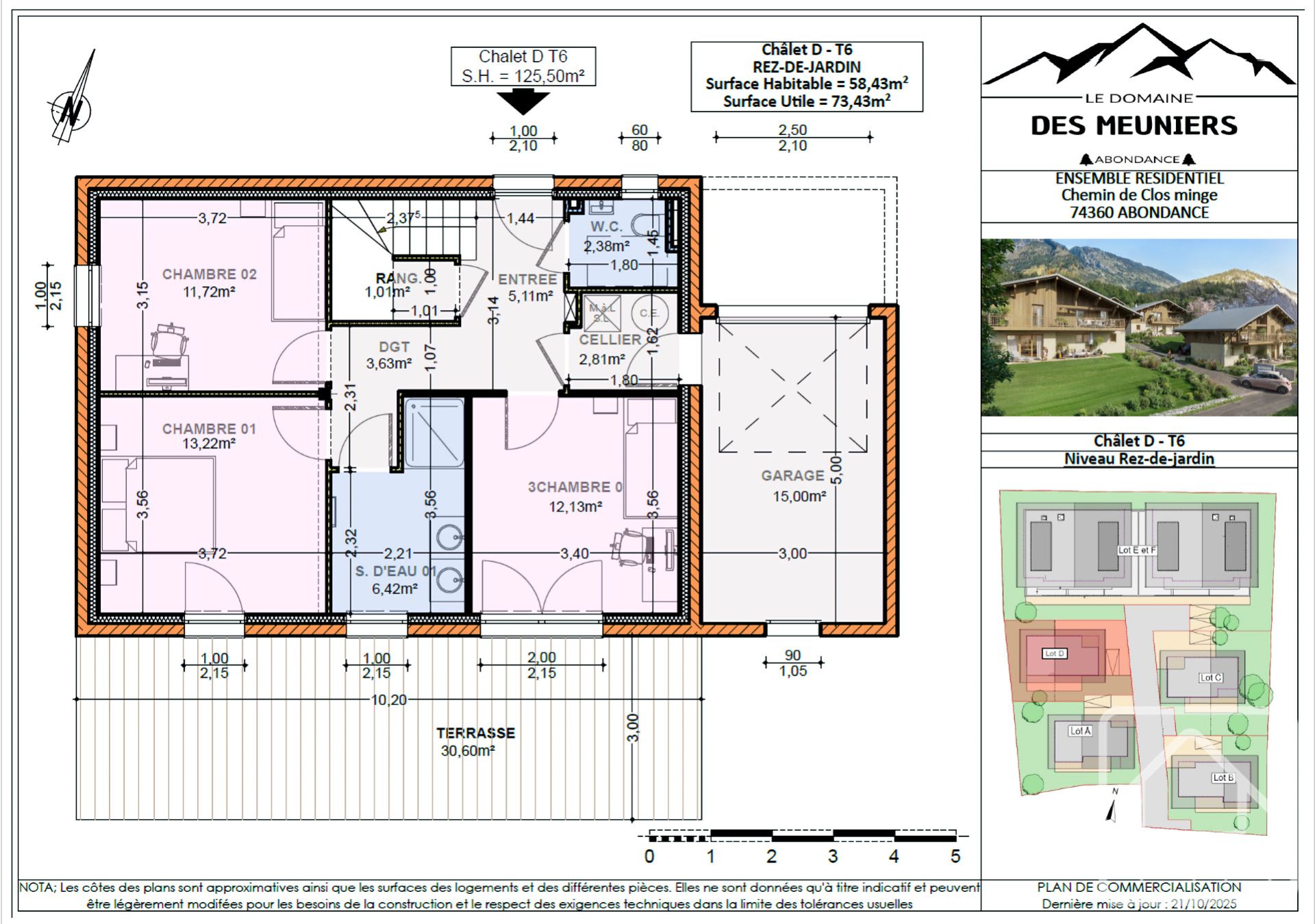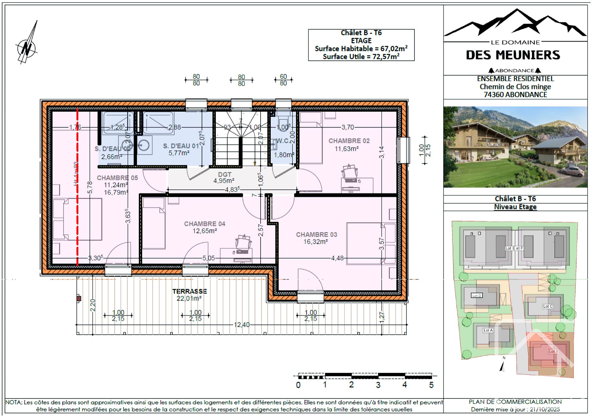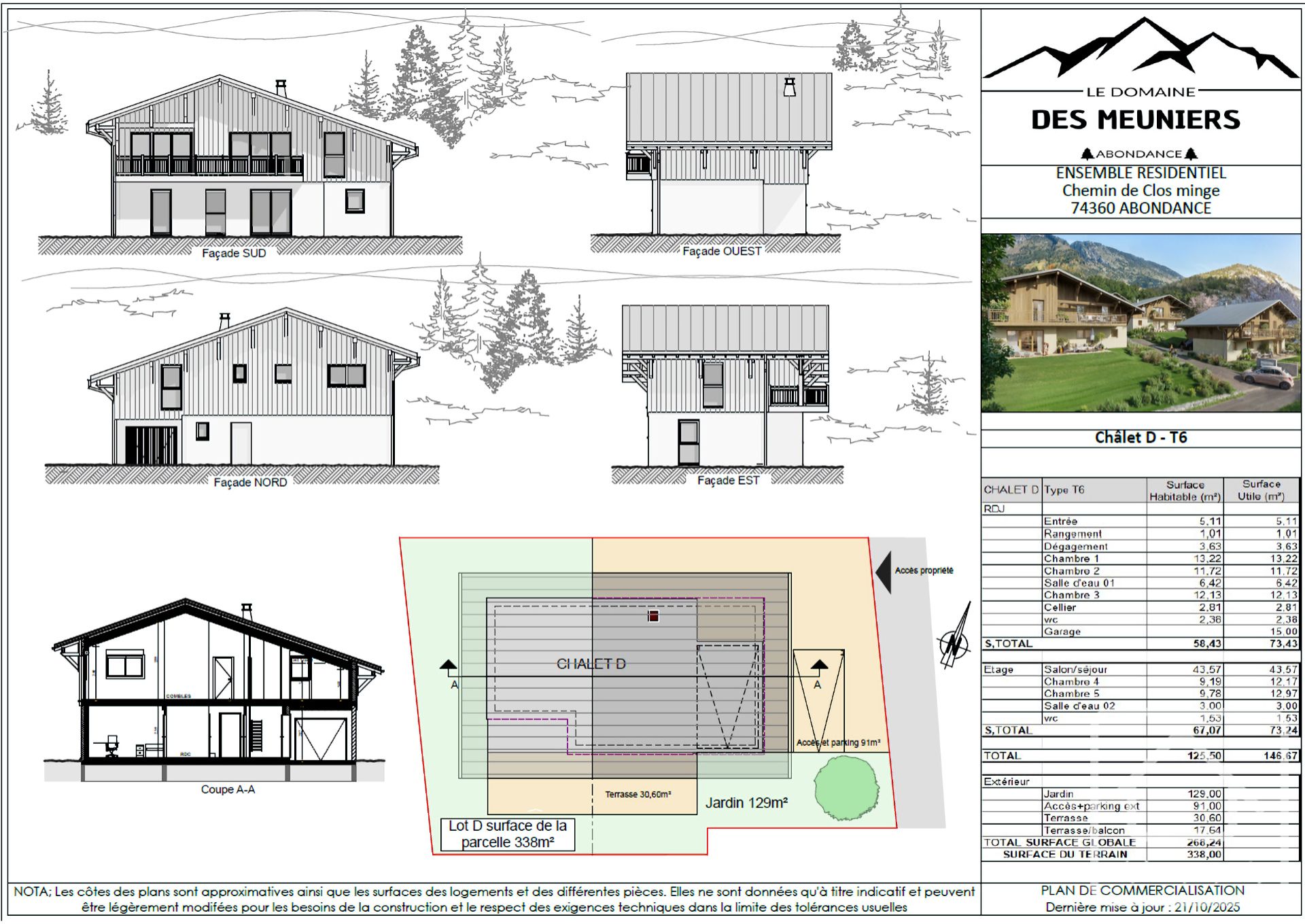 Chalet D : 5 chambres, 125,50 m² de surface habitable (146,67 m² de surface utile), balcon de 48,24 m², terrain de 338 m², prix clé en main : 725 000 €.