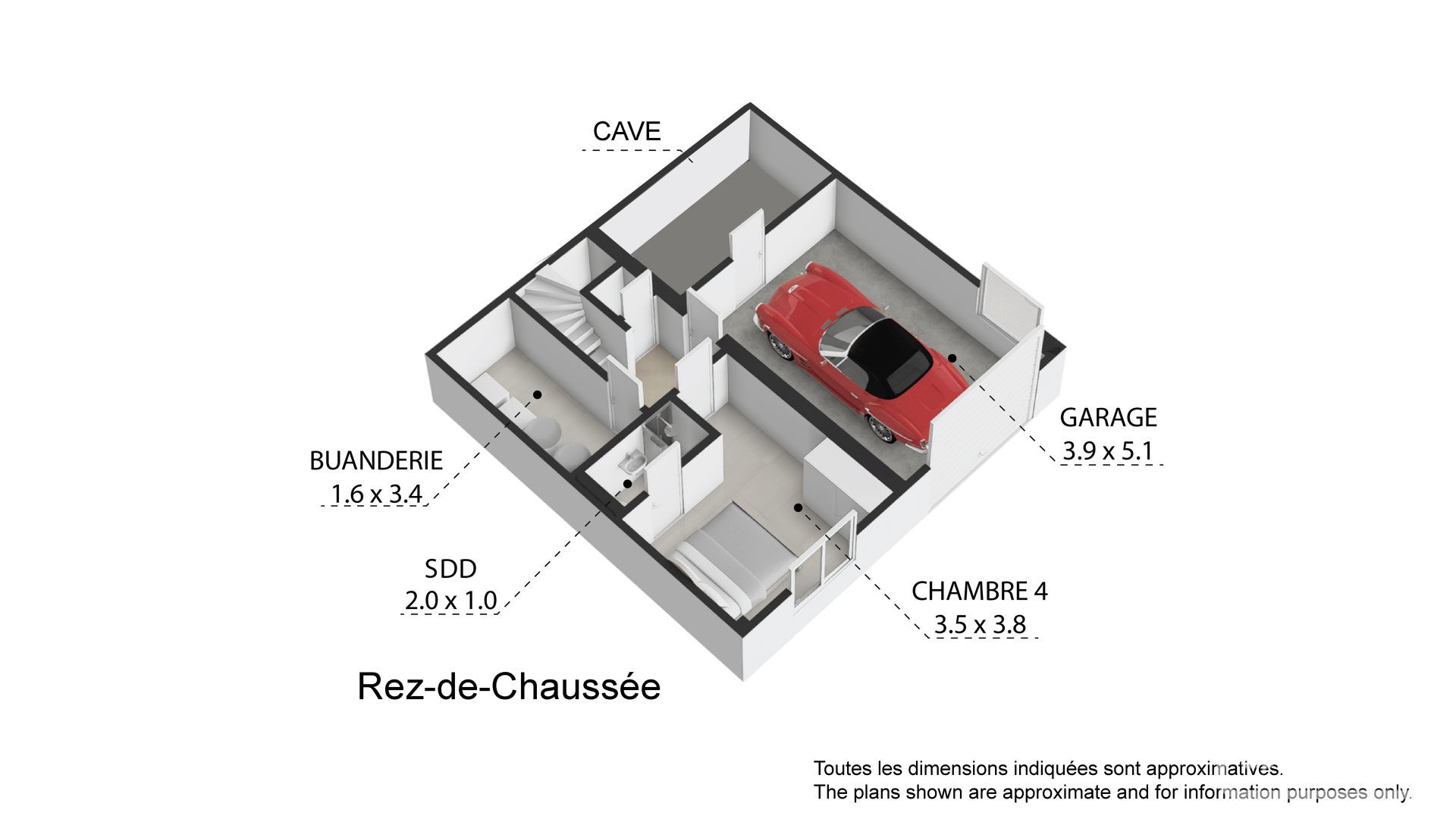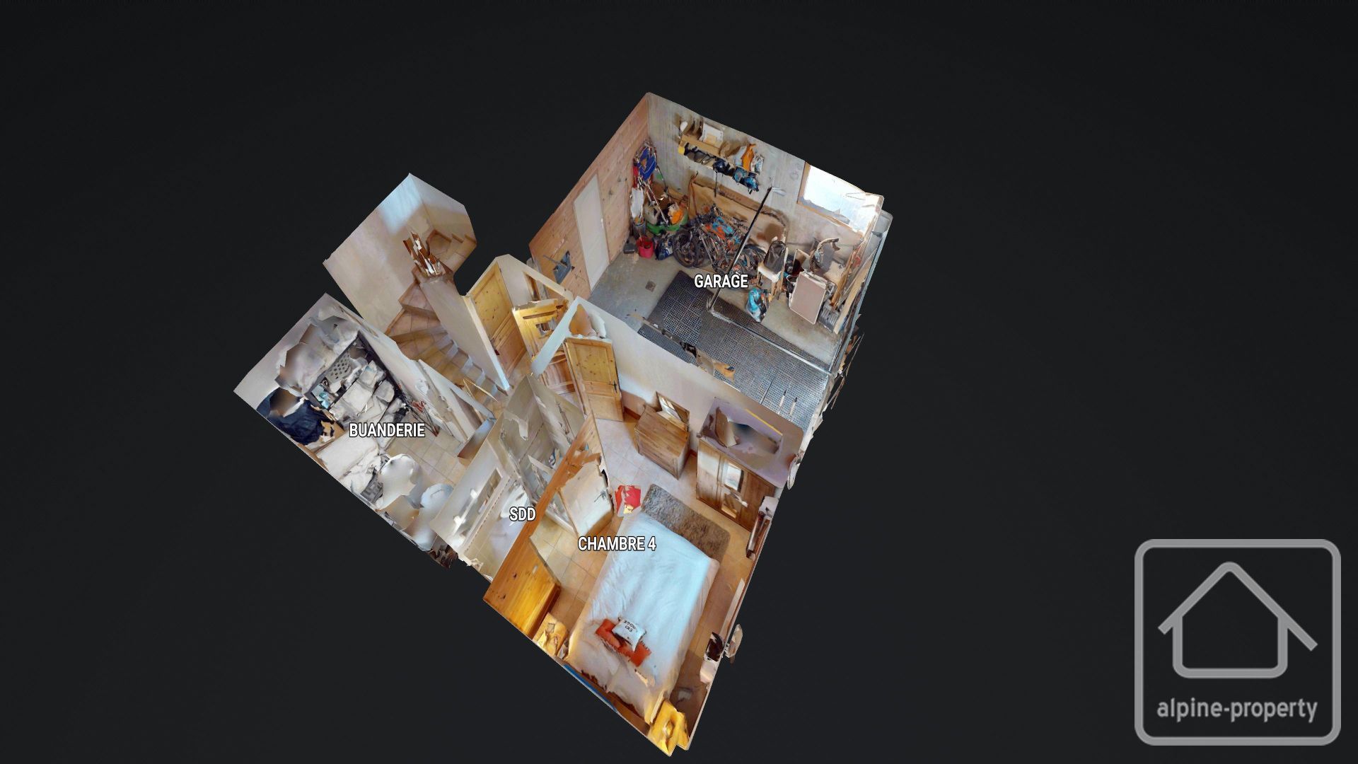 Au niveau inférieur, nous trouvons une chambre avec salle de bains en suite, ainsi qu’une buanderie, un débarras et un garage pour un véhicule.