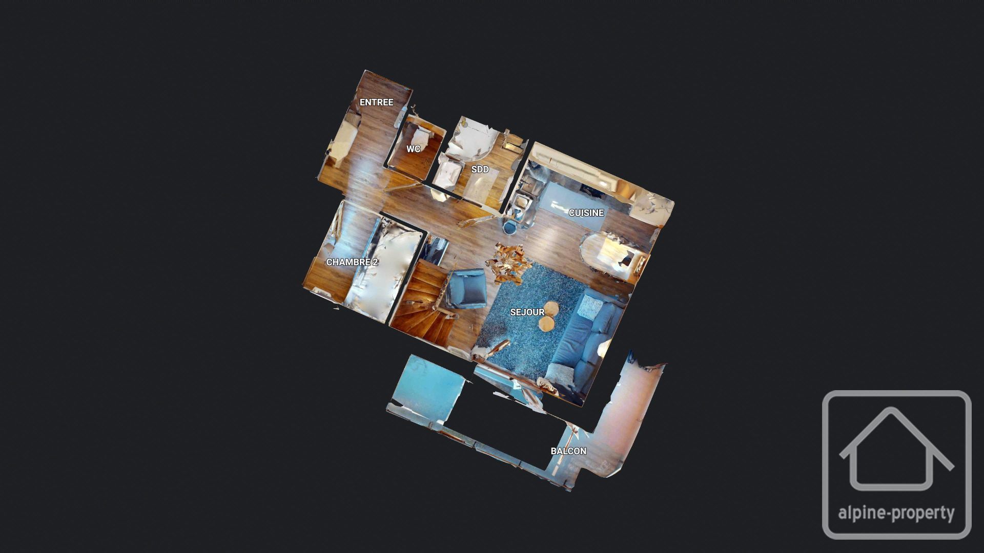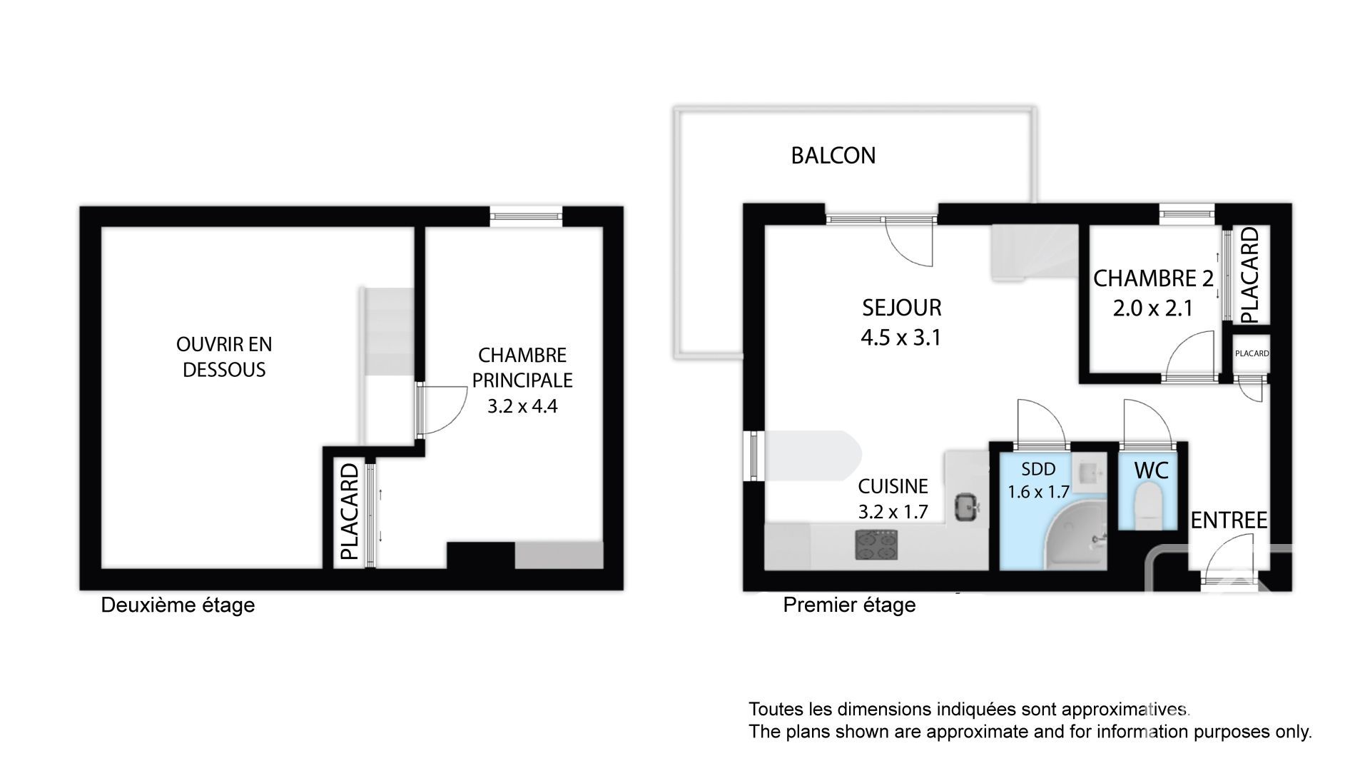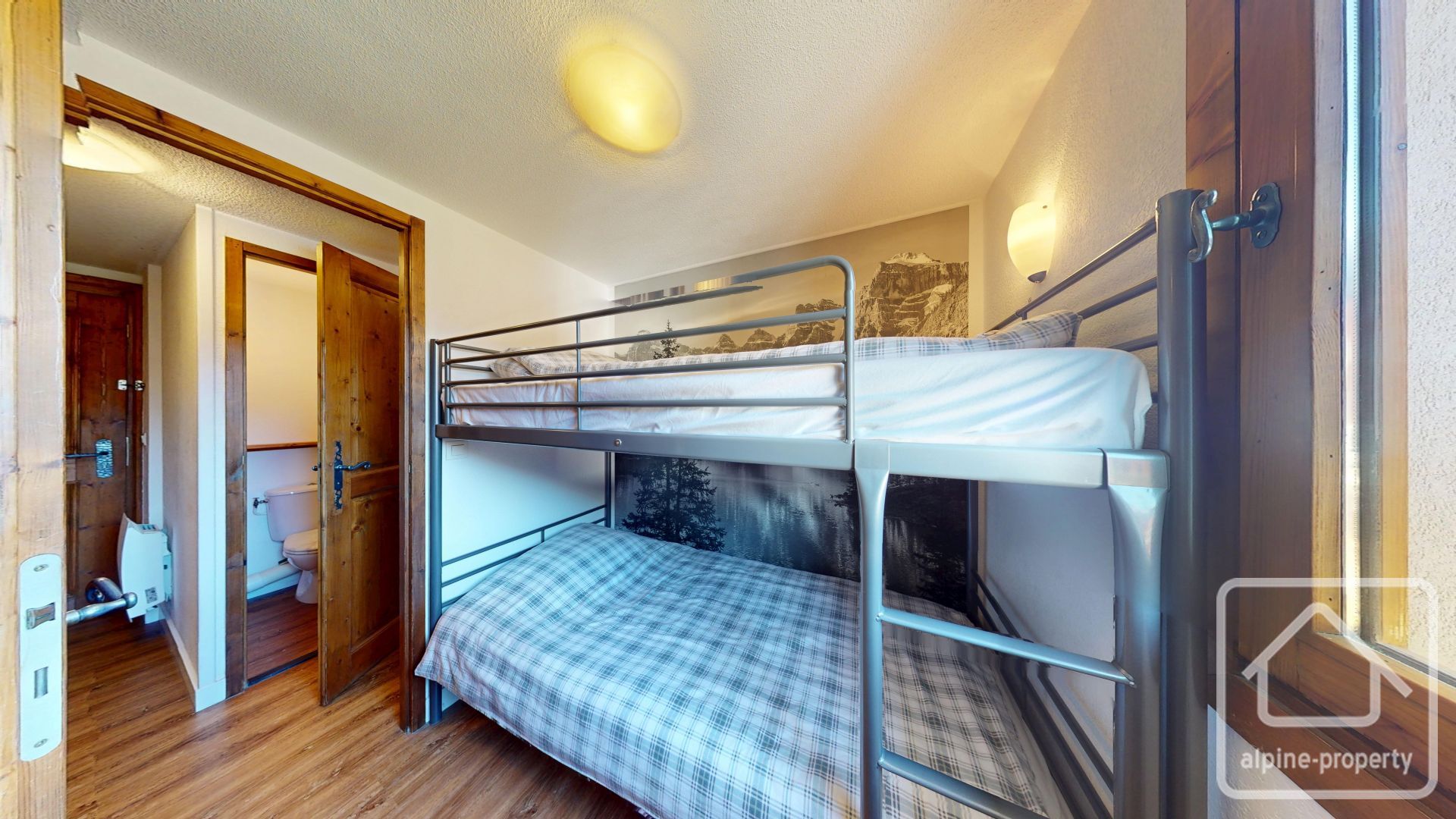 Le niveau inférieur comprend une entrée avec rangements pour manteaux et chaussures, une chambre cabine avec lits superposés et placard intégré, un WC indépendant, une salle d’eau, ainsi qu’une pièce de vie avec cuisine ouverte et accès au balcon. À l’étage, le niveau supérieur propose une spacieuse chambre double avec placard intégré et un espace bureau dédié.