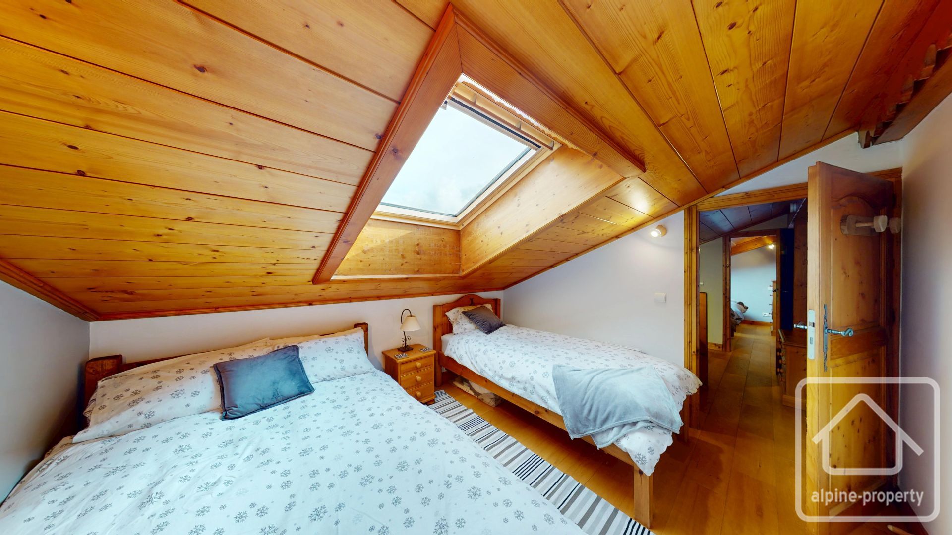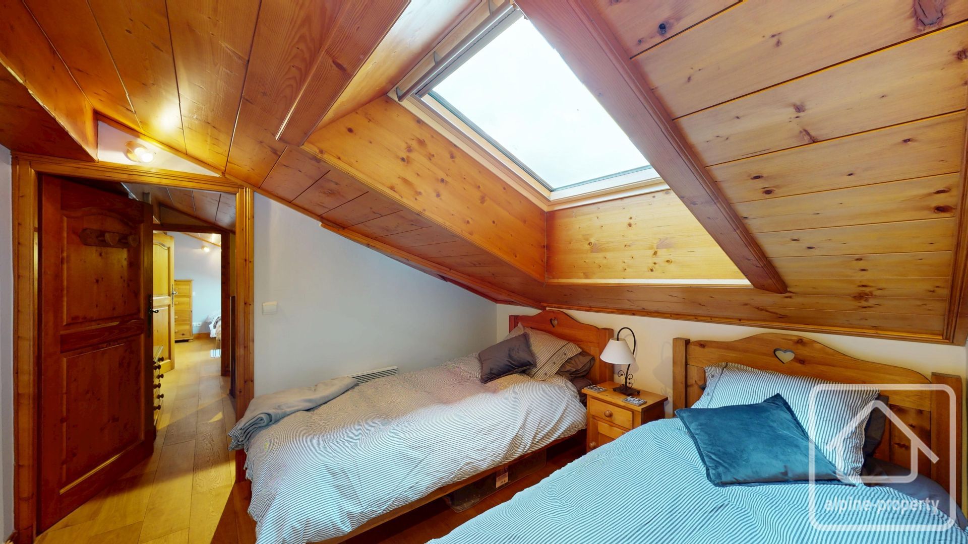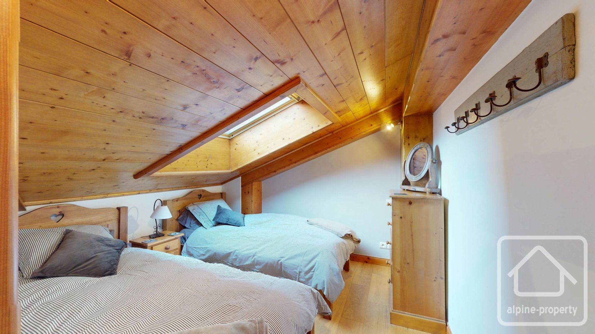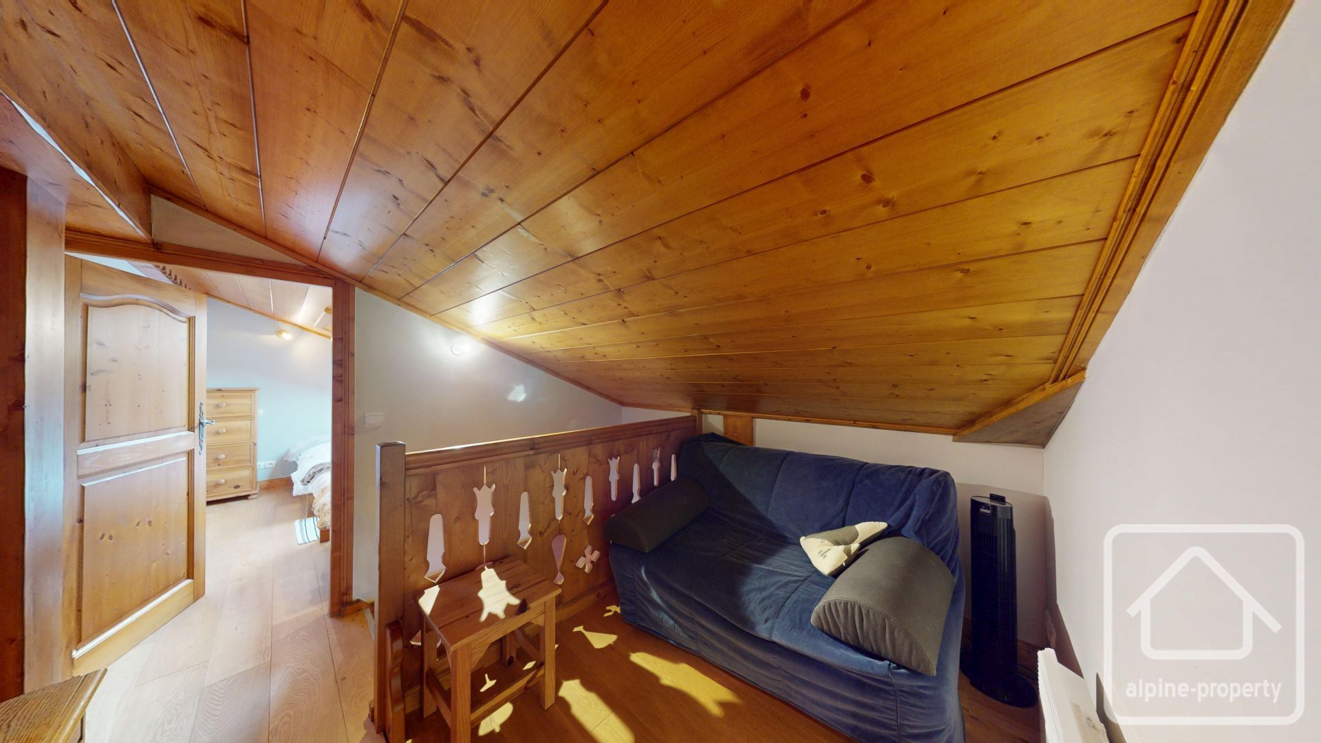 Le niveau en mezzanine offre un espace salon cosy avec un canapé-lit pour un couchage modulable, ainsi que deux autres chambres doubles sous les combles avec une hauteur sous plafond inférieure à 1,80 m.