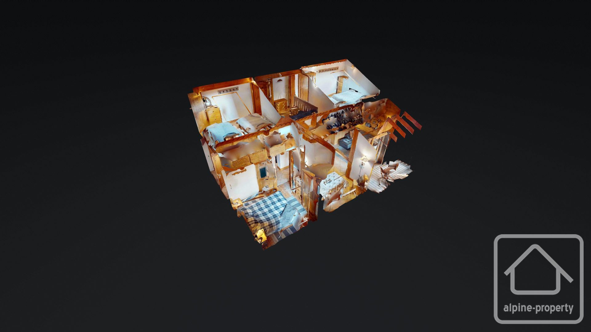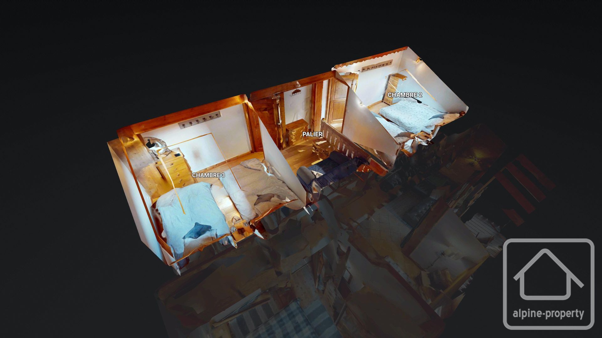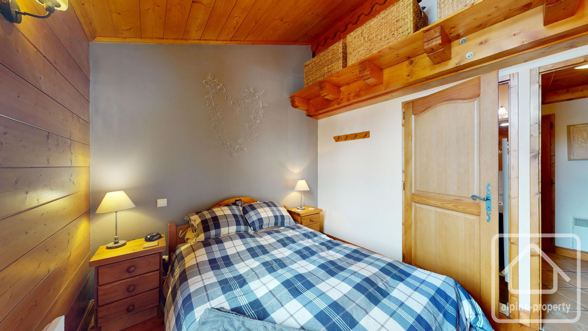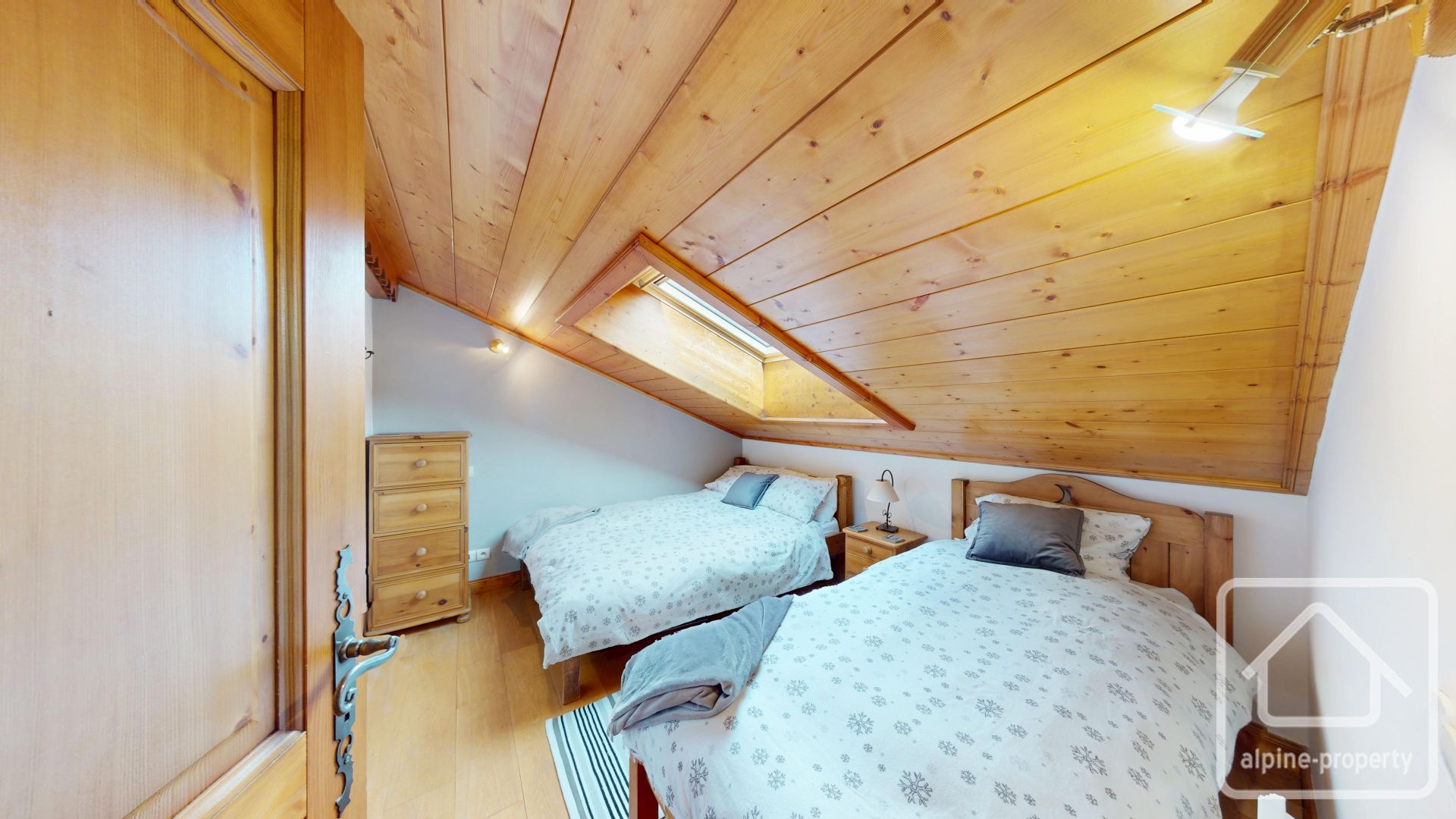 Le niveau en mezzanine offre un espace salon cosy avec un canapé-lit pour un couchage modulable, ainsi que deux autres chambres doubles sous les combles avec une hauteur sous plafond inférieure à 1,80 m.