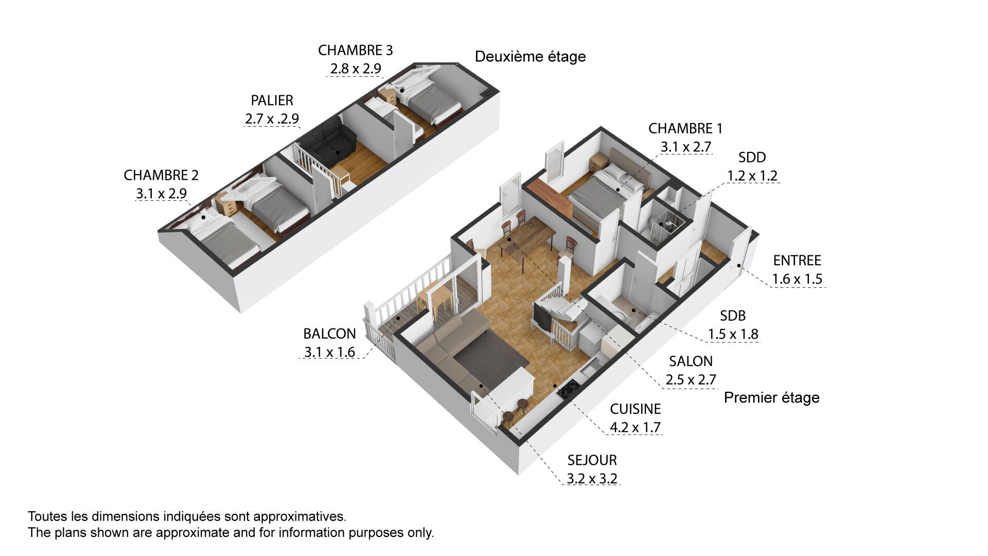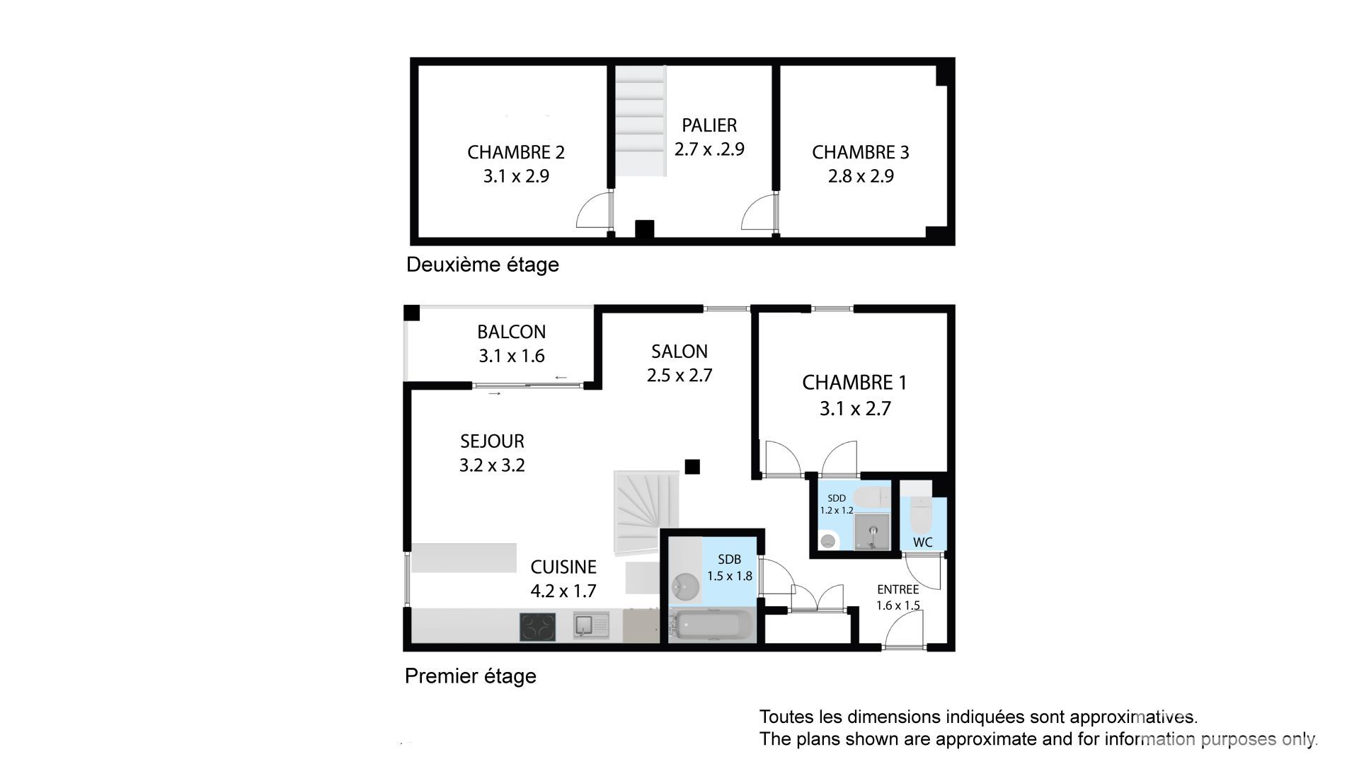Le premier niveau comprend une entrée avec rangements intégrés, un WC séparé, une salle de bains, une chambre double principale avec salle d’eau attenante et WC, un espace salle à manger ainsi qu’une cuisine ouverte sur le séjour avec accès au balcon à l'Est.