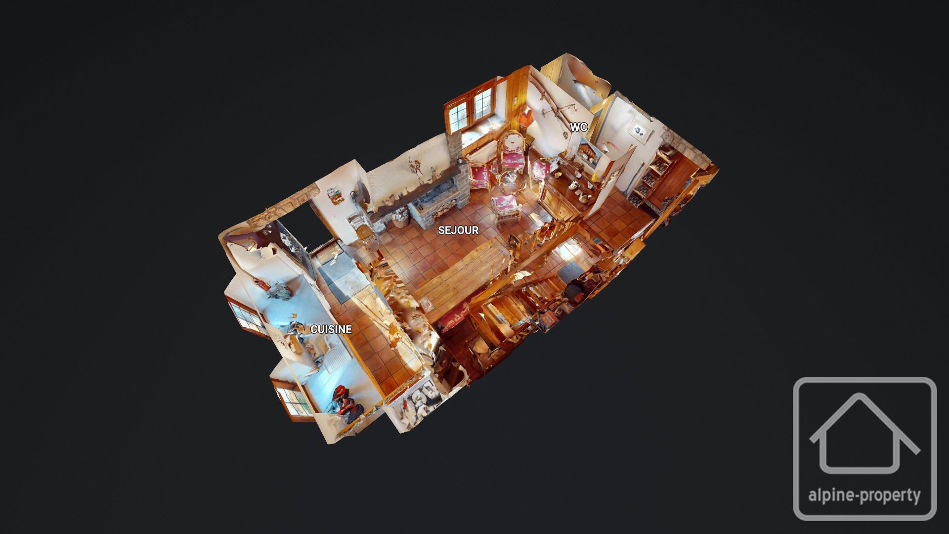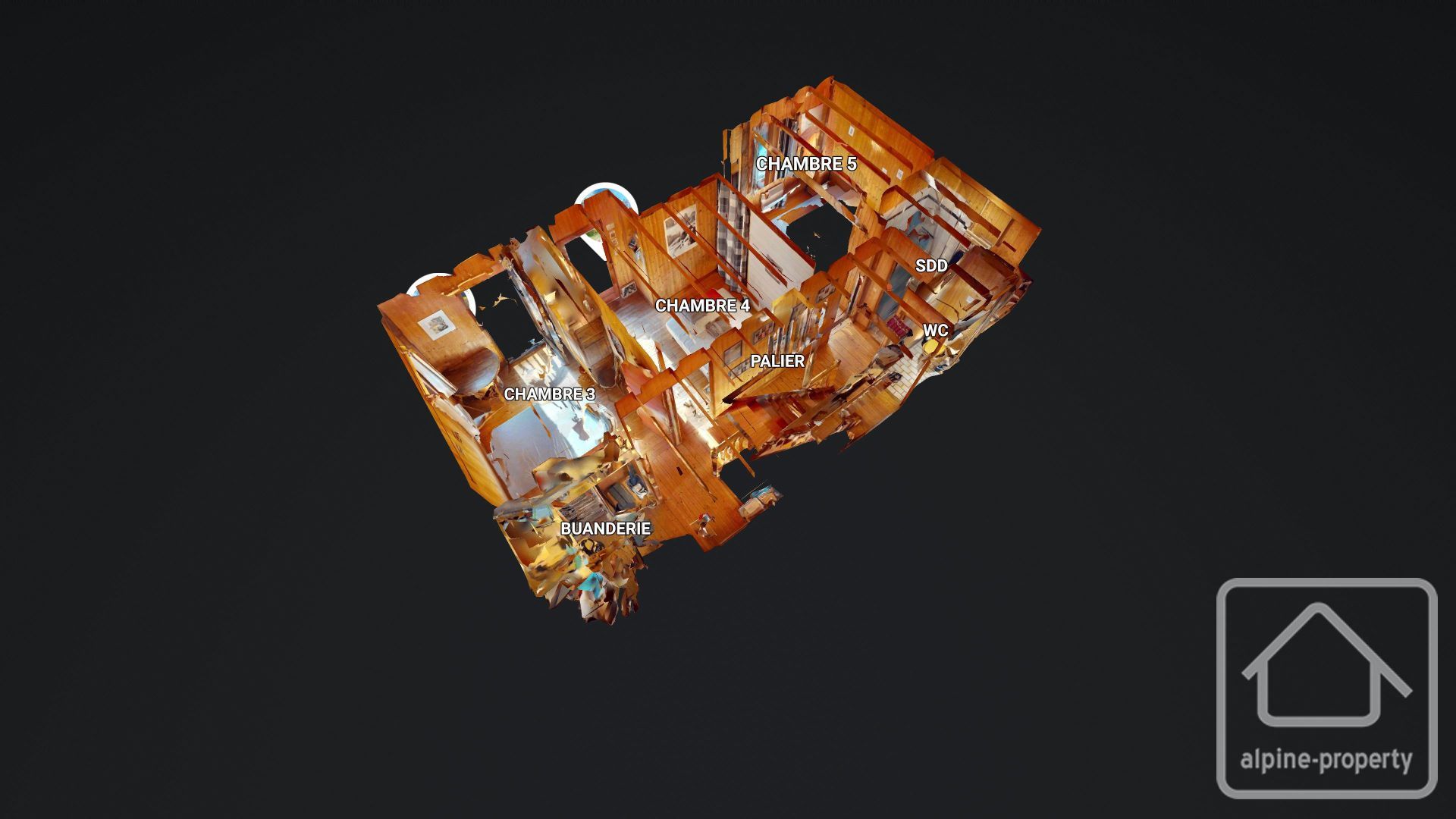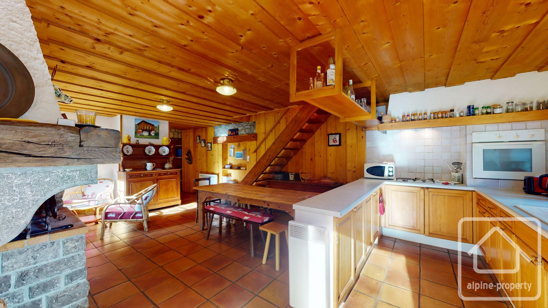 La maison actuelle, entièrement rénovée en 1981, offre environ 101 m² de surface habitable et est actuellement agencée sur trois niveaux. Au rez-de-chaussée, un espace de vie chaleureux et accueillant comprend une cuisine ouverte et une salle à manger avec une cheminée traditionnelle et un four à pain d’époque — un clin d’œil charmant à son passé agricole. On trouve également à ce niveau un WC indépendant et un espace de rangement. À l’étage, le chalet dispose de trois chambres, d’un balcon exposé sud, d’une salle d’eau, d’un WC indépendant et d’un espace de rangement supplémentaire, tandis que le dernier étage offre deux chambres supplémentaires et une seconde salle d’eau.