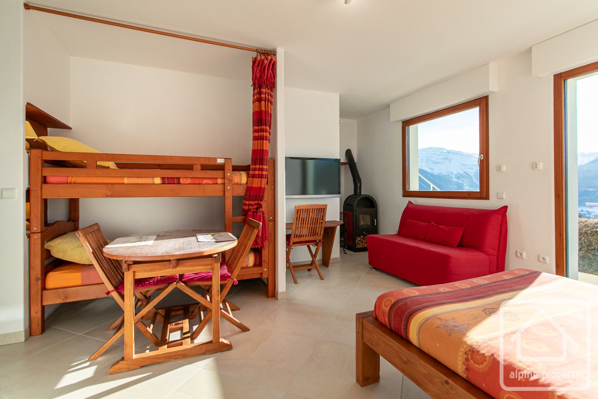 Sur ce même niveau, avec sa propre entrée indépendante, se trouve un studio autonome. Il se compose d’une salle d’eau avec WC séparés, d’un espace de vie comprenant un lit double et des lits superposés, d’une kitchenette, d’un salon avec poêle à bois, d’un coin repas et d’un accès à une terrasse privative.