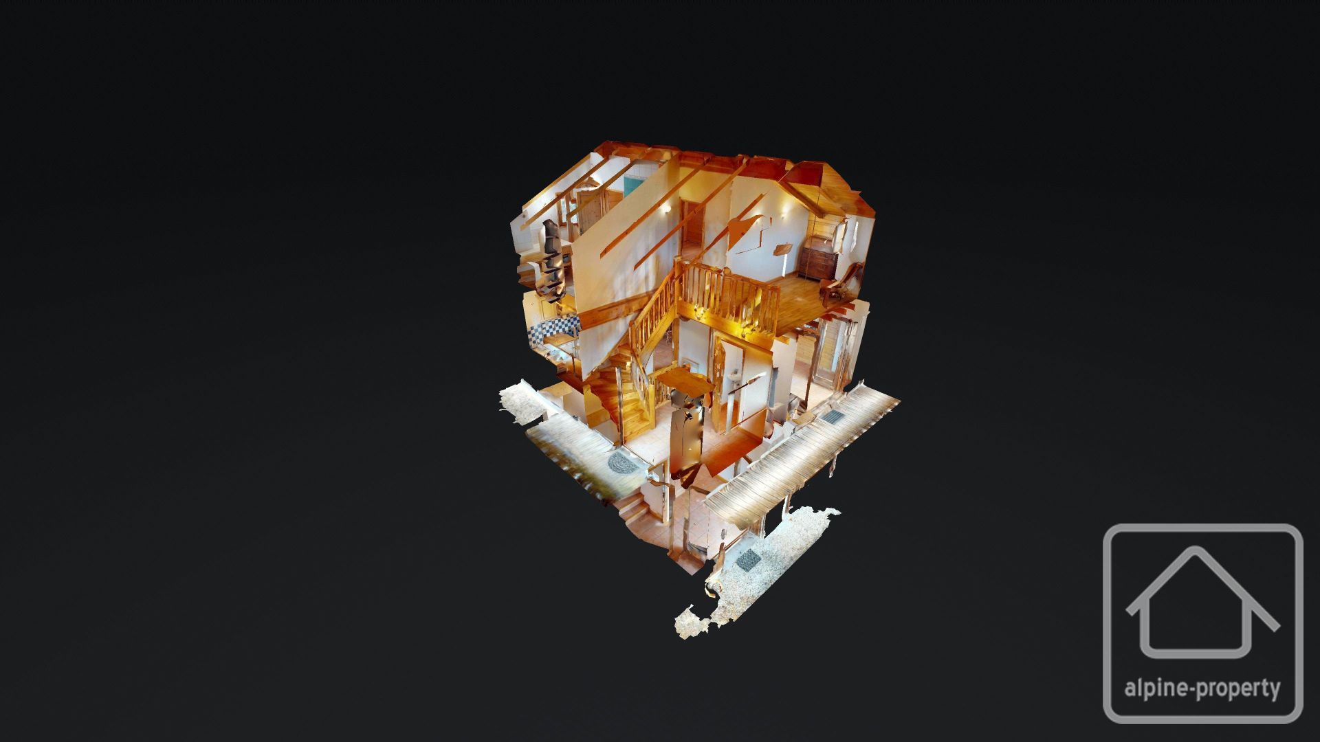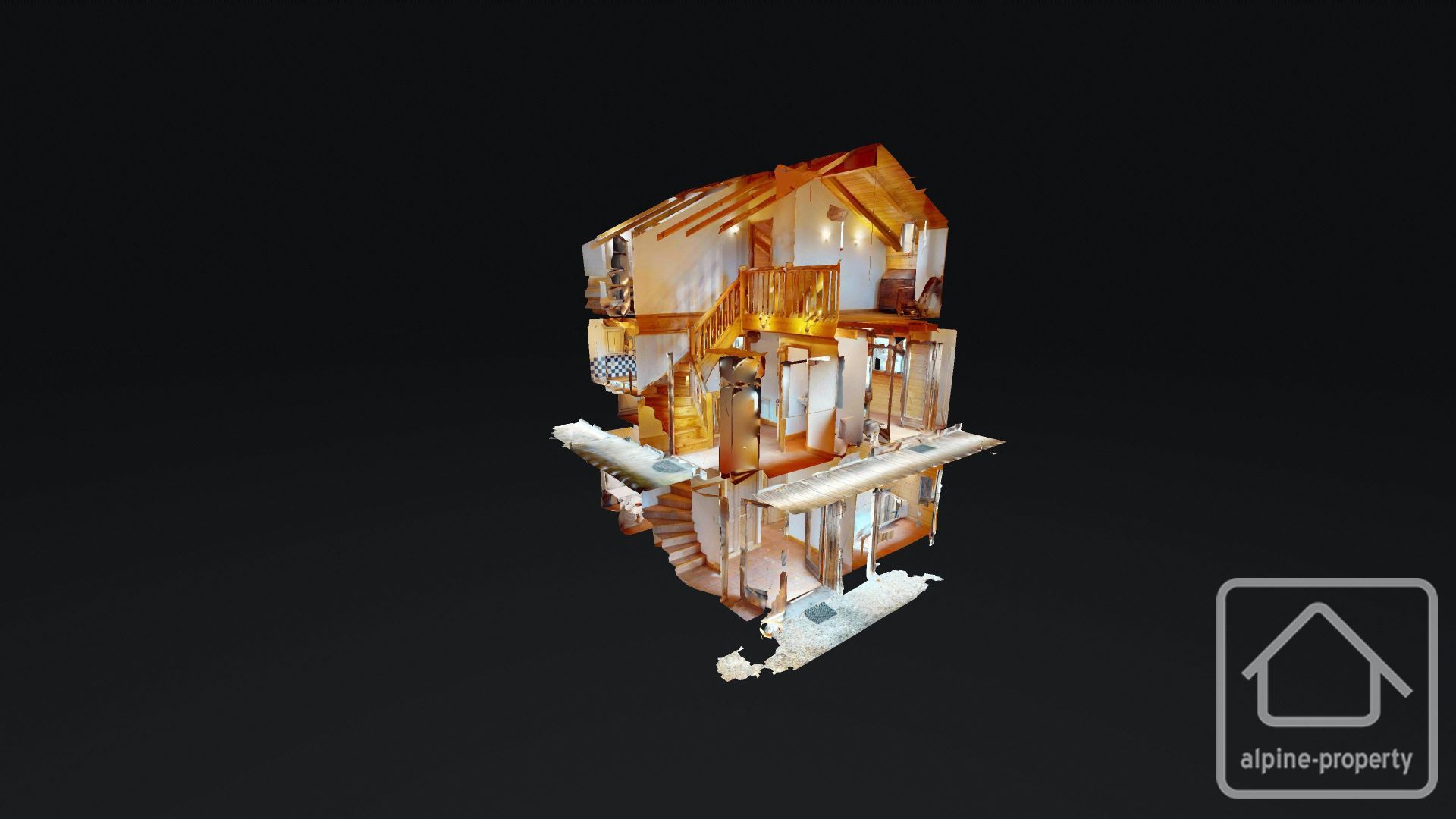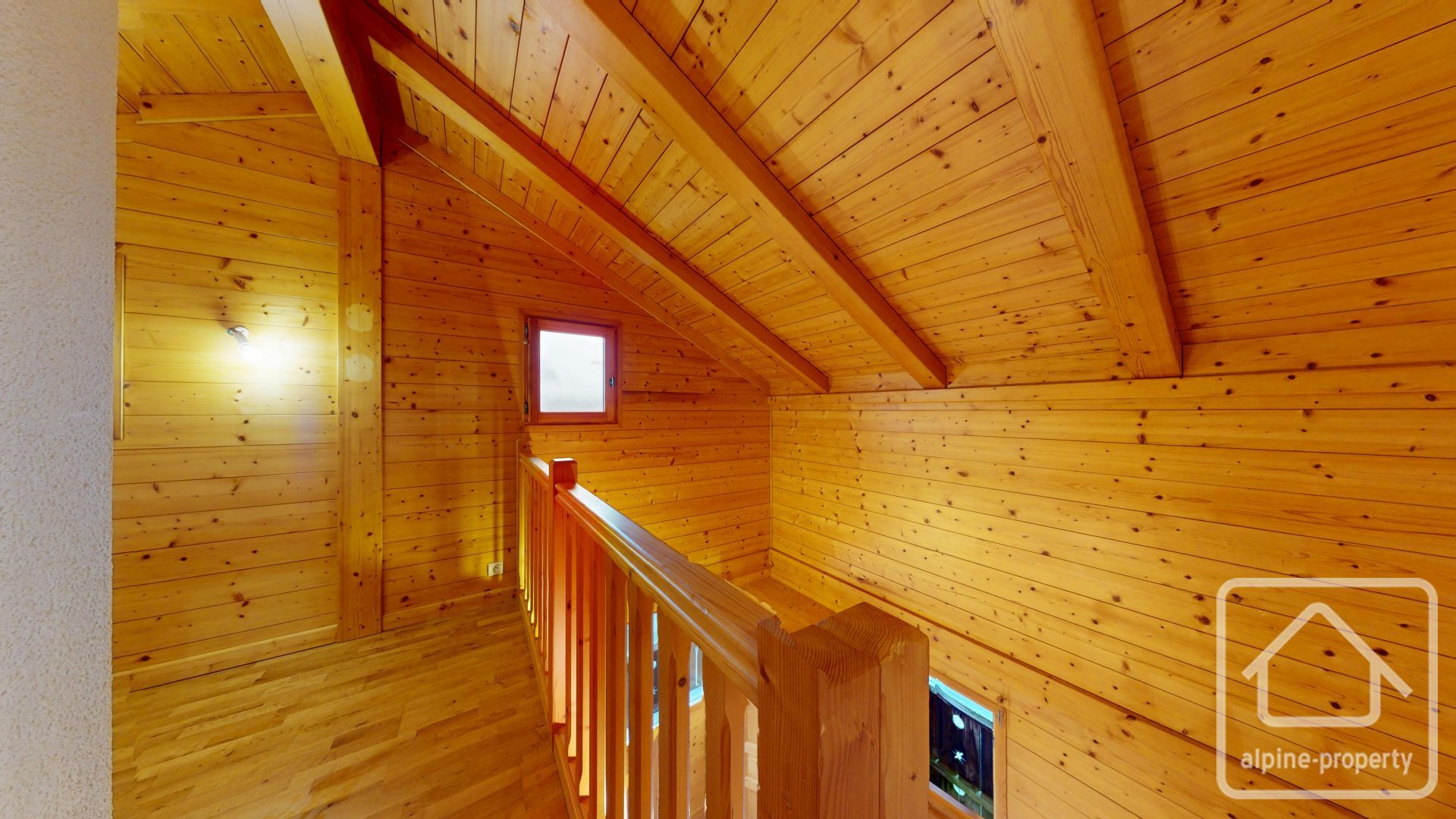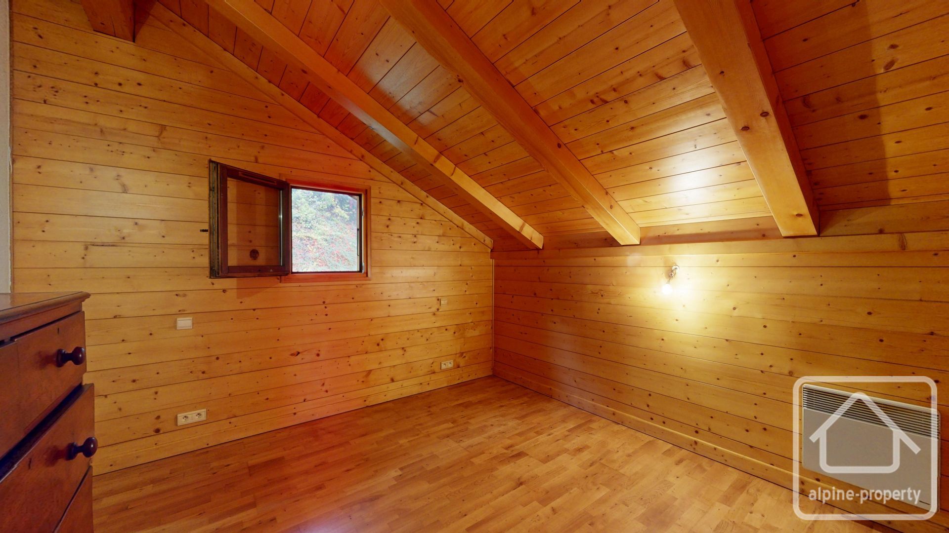 Le chalet est réparti sur trois niveaux et offre des espaces de vie lumineux et bien agencés. Au rez-de-jardin, une entrée mène à une chambre confortable avec rangements intégrés, une salle d’eau avec WC, une buanderie, un placard sous l’escalier et une pièce polyvalente actuellement utilisée comme espace de rangement mais pouvant également servir de chambre supplémentaire. Toutes les pièces de ce niveau sont reliées à l’étage principal par un escalier intérieur.